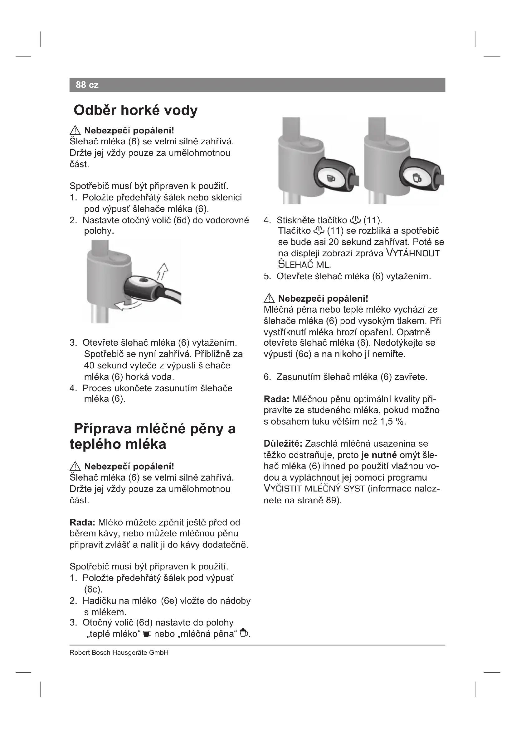 Nebezpečí popálení!Šlehač mléka (6) se velmi siln zahívá. Držte jej vždy pouze za umlohmotnou část.Spotebič musí být pipraven k použití.1. Položte pedehátý šálek nebo sklenici pod výpus šlehače mléka (6).2. Nastavte otočný volič (6d) do vodorovné polohy.3. Otevete šlehač mléka (6) vytažením. Spotebič se nyní zahívá. Pibližn za 40 sekund vyteče z výpusti šlehače mléka (6) horká voda. 4. Proces ukončete zasunutím šlehače mléka (6). Píprava mléčné pny a teplého mléka
