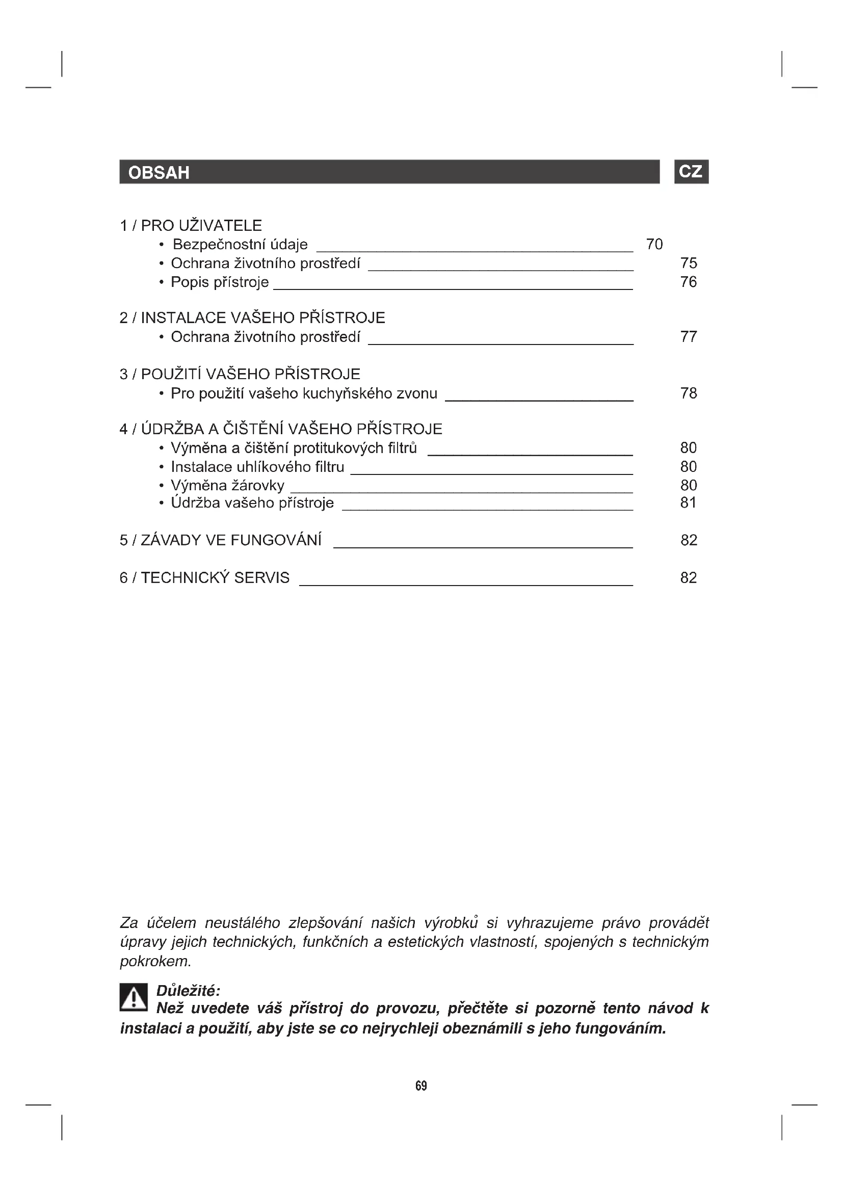 6 / TECHNICKÝ SERVIS _______________________________________ 92 Za účelem neustálého zlepšování našich výrobků si vyhrazujeme právo provádět úpravy jejich technických, funkčních a estetických vlastností, spojených s technickým pokrokem. Důležité: Než uvedete váš přístroj do provozu, přečtěte si pozorně tento návod k instalaci a použití, aby jste se co nejrychleji obeznámili s jeho fungováním.