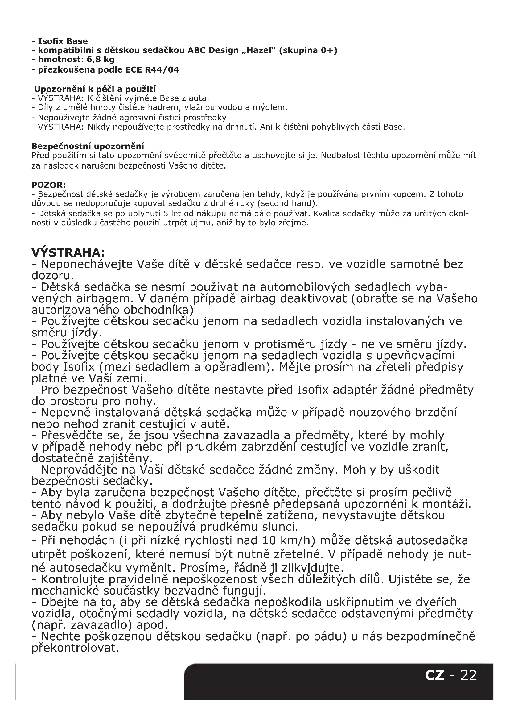 a. Wyciągnij urządzenie zwalniające (3) z obydwu stron, aż sygnalizator koloru będzie czerwony. Teraz można wyciągnąć bazę z zamocowania Isox pojazdu. b. Pociągnij zamocowanie do tyłu. Najłatwiej zrobić to w ten sposób - chwyć część plastikową do odblokowania ramion (5) i pociągnij szynę do tyłu. c. Odchyl teraz ramiona mocowania do tyłu naciskając odblokowanie (5) i odchylając ramiona do tyłu. d. Nacisnij teraz odblokowanie pałąka (4) i złóż go. e. Nacisnij czerwony przycisk regulacji na nodze oparcia i skróć ją. Na zakończenie złóż nogę oparcia.CZ - 22 - Isox Base - kompatibilní s dětskou sedačkou ABC Design „Hazel“ (skupina 0+) - hmotnost: 6,8 kg - přezkoušena podle ECE R44/04 Upozornění k péči a použití - VÝSTRAHA: K čištění vyjměte Base z auta. - Díly z umělé hmoty čistěte hadrem, vlažnou vodou a mýdlem. - Nepoužívejte žádné agresivní čisticí prostředky. - VÝSTRAHA: Nikdy nepoužívejte prostředky na drhnutí. Ani k čištění pohyblivých částí Base. Bezpečnostní upozornění Před použitím si tato upozornění svědomitě přečtěte a uschovejte si je. Nedbalost těchto upozornění může mít za následek narušení bezpečnosti Vašeho dítěte. POZOR: - Bezpečnost dětské sedačky je výrobcem zaručena jen tehdy, když je používána prvním kupcem. Z tohoto důvodu se nedoporučuje kupovat sedačku z druhé ruky (second hand). - Dětská sedačka se po uplynutí 5 let od nákupu nemá dále používat. Kvalita sedačky může za určitých okol- ností v důsledku častého použití utrpět újmu, aniž by to bylo zřejmé. VÝSTRAHA: - Neponechávejte Vaše dítě v dětské sedačce resp. ve vozidle samotné bez dozoru. - Dětská sedačka se nesmí používat na automobilových sedadlech vyba- vených airbagem. V daném případě airbag deaktivovat (obraťte se na Vašeho autorizovaného obchodníka) - Používejte dětskou sedačku jenom na sedadlech vozidla instalovaných ve směru jízdy. - Používejte dětskou sedačku jenom v protisměru jízdy - ne ve směru jízdy. - Používejte dětskou sedačku jenom na sedadlech vozidla s upevňovacími body Isox (mezi sedadlem a opěradlem). Mějte prosím na zřeteli předpisy platné ve Vaší zemi. - Pro bezpečnost Vašeho dítěte nestavte před Isox adaptér žádné předměty do prostoru pro nohy. - Nepevně instalovaná dětská sedačka může v případě nouzového brzdění nebo nehod zranit cestující v autě. - Přesvědčte se, že jsou všechna zavazadla a předměty, které by mohly v případě nehody nebo při prudkém zabrzdění cestující ve vozidle zranit, dostatečně zajištěny. - Neprovádějte na Vaší dětské sedačce žádné změny. Mohly by uškodit bezpečnosti sedačky. - Aby byla zaručena bezpečnost Vašeho dítěte, přečtěte si prosím pečlivě tento návod k použití, a dodržujte přesně předepsaná upozornění k montáži. - Aby nebylo Vaše dítě zbytečné tepelně zatíženo, nevystavujte dětskou sedačku pokud se nepoužívá prudkému slunci. - Při nehodách (i při nízké rychlosti nad 10 km/h) může dětská autosedačka utrpět poškození, které nemusí být nutně zřetelné. V případě nehody je nut- né autosedačku vyměnit. Prosíme, řádně ji zlikvidujte. - Kontrolujte pravidelně nepoškozenost všech důležitých dílů. Ujistěte se, že mechanické součástky bezvadně fungují. - Dbejte na to, aby se dětská sedačka nepoškodila uskřípnutím ve dveřích vozidla, otočnými sedadly vozidla, na dětské sedačce odstavenými předměty (např. zavazadlo) apod. - Nechte poškozenou dětskou sedačku (např. po pádu) u nás bezpodmínečně překontrolovat.CZ - 23