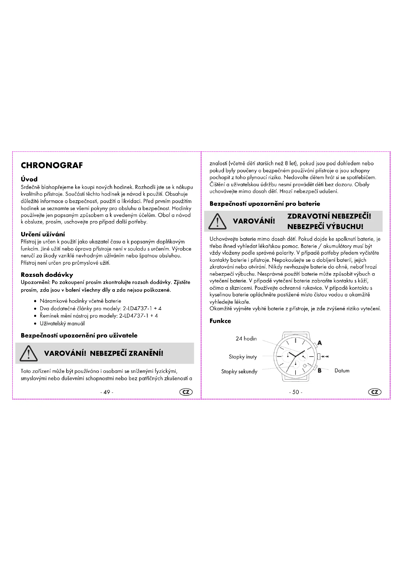 CHRONOGRAF Úvod Srdečně blahopřejeme ke koupi nových hodinek. Rozhodli jste se k nákupu kvalitního přístroje. Součástí těchto hodinek je návod k použití. Obsahuje důležité informace o bezpečnosti, použití a likvidaci. Před prvním použitím hodinek se seznamte se všemi pokyny pro obsluhu a bezpečnost. Hodinky používejte jen popsaným způsobem a k uvedeným účelům. Obal a návod k obsluze, prosím, uschovejte pro případ další potřeby. Určení užívání Přístroj je určen k použití jako ukazatel času a k popsaným doplňkovým funkcím. Jiné užití nebo úprava přístroje není v souladu s určením. Výrobce neručí za škody vzniklé nevhodným užíváním nebo špatnou obsluhou. Přístroj není určen pro průmyslové užití. Rozsah dodávky Upozornění: Po zakoupení prosím zkontrolujte rozsah dodávky. Zjistěte prosím, zda jsou v balení všechny díly a zda nejsou poškozené.