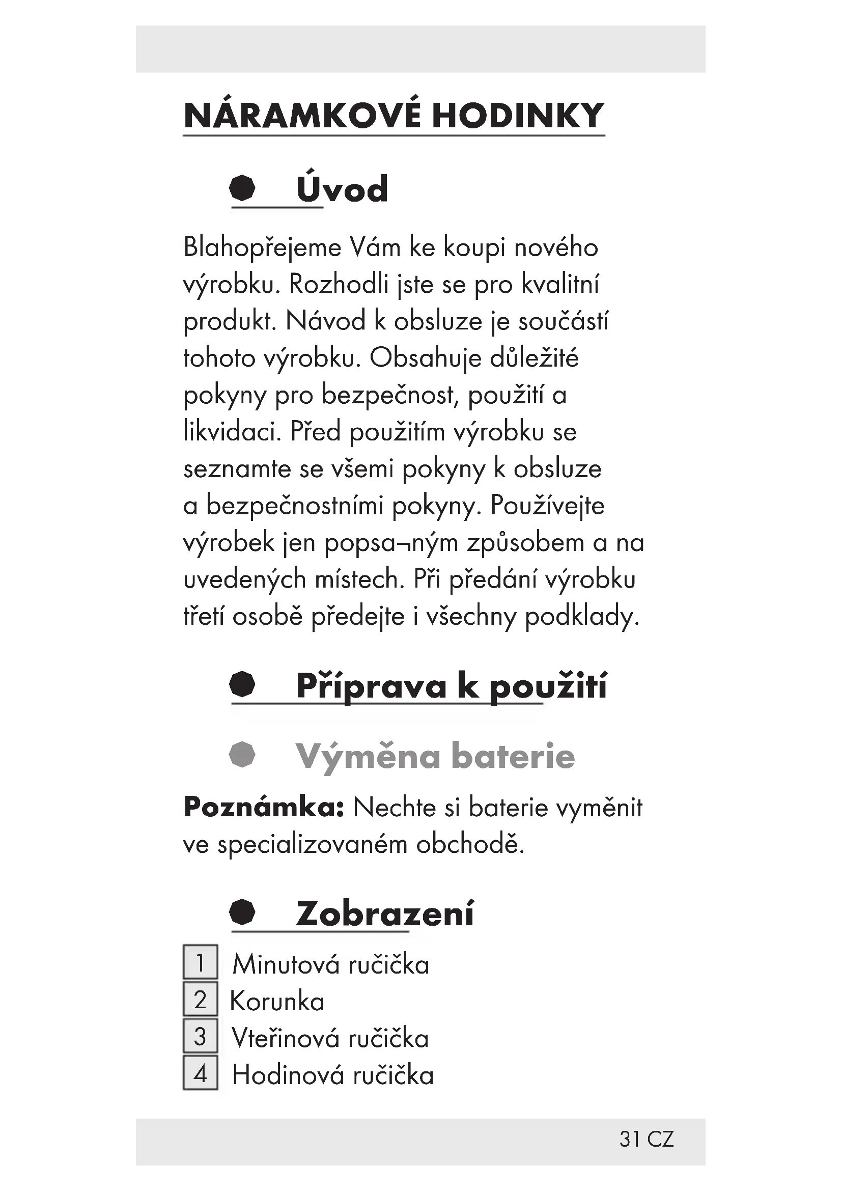 § Úvod Blahopřejeme Vám ke koupi nového výrobku. Rozhodli jste se pro kvalitní produkt. Návod k obsluze je součástí tohoto výrobku. Obsahuje důležité pokyny pro bezpečnost, použití a likvidaci. Před použitím výrobku se seznamte se všemi pokyny k obsluze a bezpečnostními pokyny. Používejte výrobek jen popsa¬ným způsobem a na uvedených místech. Při předání výrobku třetí osobě předejte i všechny podklady. § Příprava k použití § Výměna baterie Poznámka: Nechte si baterie vyměnit ve specializovaném obchodě. § Zobrazení