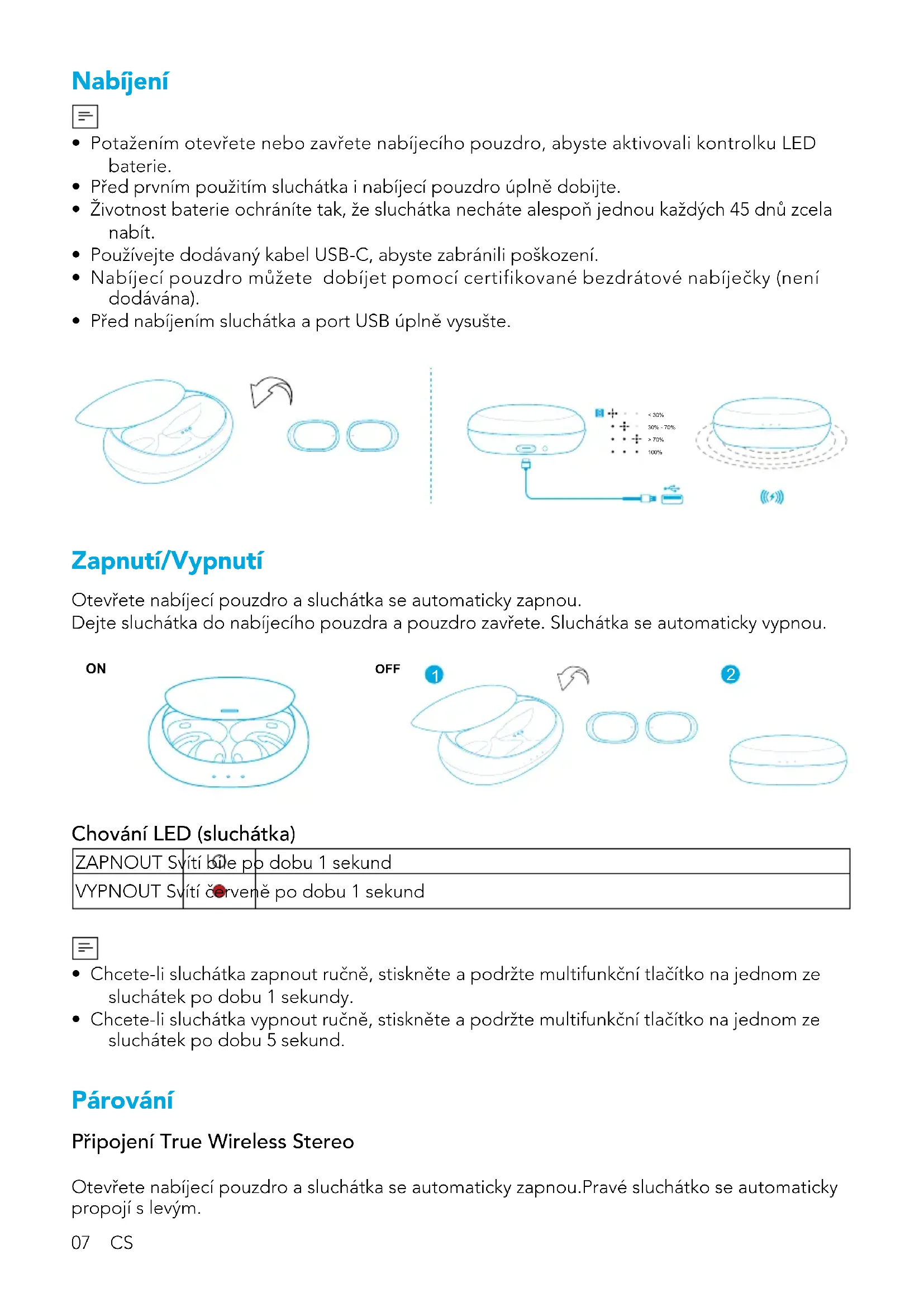 - Chcete-li sluchátka vypnout ručně, stiskněte a podržte multifunkční tlačítko na jednom ze sluchátek po dobu 5 sekund. Párování Připojení True Wireless Stereo Otevřete nabíjecí pouzdro a sluchátka se automaticky zapnou.Pravé sluchátko se automaticky propojí s levým.CS 08 Chování LED (sluchátka) Bliká bíle Připojování TWS Svítí bíle po dobu 1 sekund TWS připojeno