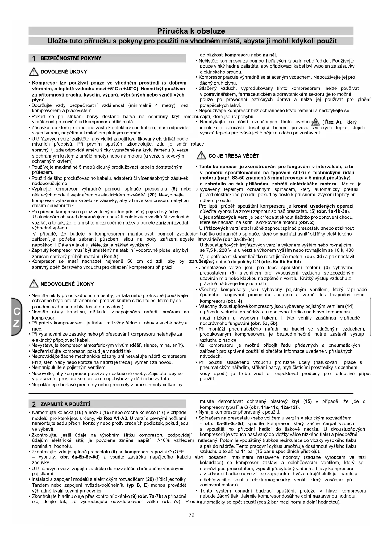 - Zkontrolujtehladinuolejepřeskontrolníokénko(9)(obr. 7a-7b)apřípadně olej dolijte tak, že vyšroubujete odvzdušňovací zátku (ob. 7c). Předtímmusíte demontovat ochranný plastový kryt (15) v případě, že jde okompresorytypuFaG(obr. 11a-11c, 12a-12f).•Nyníjekompresorpřipravenýkpoužití.•Spínačemnapresostatu(nebovoličemuverzíselektrickýmrozváděčem - obr. 6a-6b-6c-6d) spustíte kompresor, který začne čerpat vzduch a vpouštět ho přívodní hadicí do tlakové nádrže. U dvoustupňovýchkompresorůjevzduchnasávanýdovložkyválcenízkéhotlakuapředběžněstlačený.Potomjevpouštěnýtrubkourecirkulacedovložkyvysokéhotlakuapakdonádrže.Tentopracovnícyklusumožňujedosáhnoutvyššíhotlakuvzduchuatoažna11bar(15baruspeciálníchpřístrojů).•Při dosažení maximální nastavené hodnoty (zadané výrobcem ve fázikolaudace) se kompresor zastaví a odlehčovacím ventilem, který senacházípodpresostatem,vypustípřebytečnývzduchzhlavykompresoruazpřívodníhadice(uverzí sezapojením hvězda-trojúhelníkje namístoodlehčovacího ventilu elektromagnetický ventil, který zasáhne přizastavenímotoru).•Tento systém usnadní budoucí spuštění, protože v hlavě kompresorunebudežádnýtlak.Jakmilekompresordosáhnedolnínastavenouhodnotu,automatickyseopětspustí(cca2barmezihorníadolníhodnotou). Uložte tuto příručku s pokyny pro použití na vhodném místě, abyste ji mohli kdykoli použít Příručka k obsluze77
