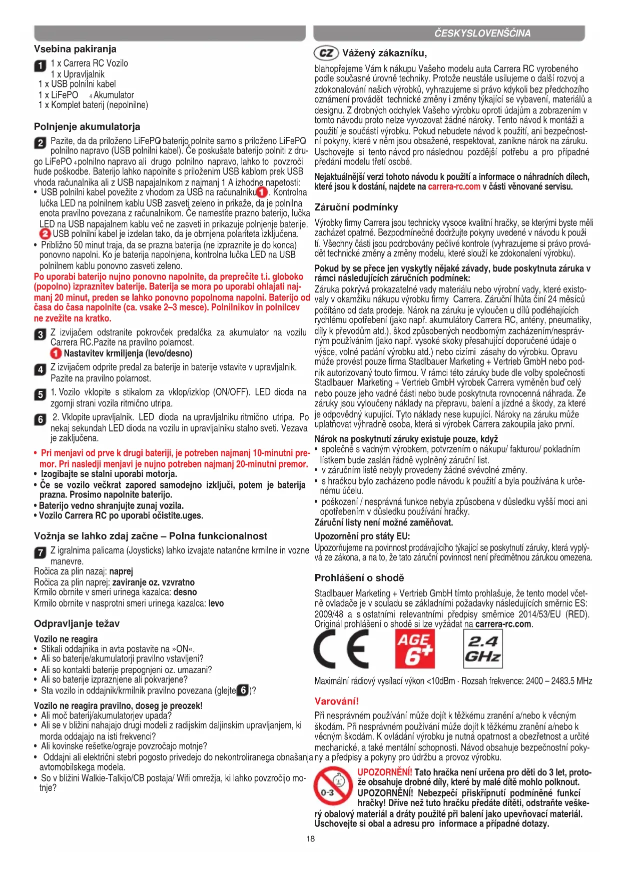 tí. Všechny části jsou podrobovány pečlivé kontrole (vyhrazujeme si právo prová- dět technické změny a změny modelu, které slouží ke zdokonalení výrobku). Pokud by se přece jen vyskytly nějaké závady, bude poskytnuta záruka v rámci následujících záručních podmínek: Záruka pokrývá prokazatelné vady materiálu nebo výrobní vady, které existo- valy v okamžiku nákupu výrobku firmy Carrera. Záruční lhůta činí 24 měsíců počítáno od data prodeje. Nárok na záruku je vyloučen u dílů podléhajících rychlému opotřebení (jako např. akumulátory Carrera RC, antény, pneumatiky, díly k převodům atd.), škod způsobených neodborným zacházením/nespráv- ným používáním (jako např. vysoké skoky přesahující doporučené údaje o výšce, volné padání výrobku atd.) nebo cizími zásahy do výrobku. Opravu může provést pouze firma Stadlbauer Marketing + Vertrieb GmbH nebo pod- nik autorizovaný touto firmou. V rámci této záruky bude dle volby společnosti Stadlbauer Marketing + Vertrieb GmbH výrobek Carrera vyměněn buď celý nebo pouze jeho vadné části nebo bude poskytnuta rovnocenná náhrada. Ze záruky jsou vyloučeny náklady na přepravu, balení a jízdné a škody, za které je odpovědný kupující. Tyto náklady nese kupující. Nároky na záruku může uplatňovat výhradně osoba, která si výrobek Carrera zakoupila jako první. Nárok na poskytnutí záruky existuje pouze, když