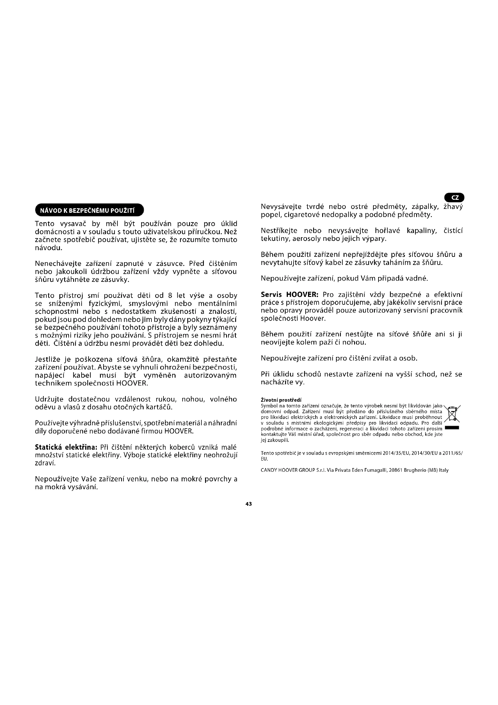 Części zapasowe i materiały eksploatacyjne firmy Hoover Należy zawsze wymieniać części na oryginalne części zapasowe firmy Hoover. Można je nabyć w lokalnym serwisie firmy Hoover lub bezpośrednio w firmie Hoover. Przy zamawianiu części zawsze należy podać numer danego modelu. Jakość Fabryki firmy Hoover zostały poddane niezależnej kontroli pod kątem jakości. Nasze produkty zostały wytworzone z wykorzystaniem systemu kontroli jakości spełniającego wymogi normy ISO 9001. Gwarancja Warunki gwarancji na niniejsze urządzenie są określone przez naszego przedstawiciela w kraju, w którym urządzenie jest sprzedawane. Szczegółowe informacje na temat warunków gwarancji można uzyskać w punkcie, w którym urządzenie zostało nabyte. Przy zgłaszaniu wszelkich roszczeń w ramach gwarancji należy przedstawić dowód sprzedaży lub pokwitowanie. Zastrzegamy sobie możliwość wprowadzania zmian bez wcześniejszego powiadomienia. PLNÁVOD K BEZPEČNÉMU POUŽITÍ Tento vysavač by měl být používán pouze pro úklid domácnosti a v souladu s touto uživatelskou příručkou. Než začnete spotřebič používat, ujistěte se, že rozumíte tomuto návodu. Nenechávejte zařízení zapnuté v zásuvce. Před čištěním nebo jakoukoli údržbou zařízení vždy vypněte a síťovou šňůru vytáhněte ze zásuvky. Tento přístroj smí používat děti od 8 let výše a osoby se sníženými fyzickými, smyslovými nebo mentálními schopnostmi nebo s nedostatkem zkušeností a znalostí, pokud jsou pod dohledem nebo jim byly dány pokyny týkající se bezpečného používání tohoto přístroje a byly seznámeny s možnými riziky jeho používání. S přístrojem se nesmí hrát děti. Čištění a údržbu nesmí provádět děti bez dohledu. Jestliže je poškozena síťová šňůra, okamžitě přestaňte zařízení používat. Abyste se vyhnuli ohrožení bezpečnosti, napájecí kabel musí být vyměněn autorizovaným technikem společnosti HOOVER. Udržujte dostatečnou vzdálenost rukou, nohou, volného oděvu a vlasů z dosahu otočných kartáčů. Používejte výhradně příslušenství, spotřební materiál a náhradní díly doporučené nebo dodávané firmou HOOVER. Statická elektřina: Při čištění některých koberců vzniká malé množství statické elektřiny. Výboje statické elektřiny neohrožují zdraví. Nepoužívejte Vaše zařízení venku, nebo na mokré povrchy a na mokrá vysávání. Nevysávejte tvrdé nebo ostré předměty, zápalky, žhavý popel, cigaretové nedopalky a podobné předměty. Nestříkejte nebo nevysávejte hořlavé kapaliny, čistící tekutiny, aerosoly nebo jejich výpary. Během použití zařízení nepřejíždějte přes síťovou šňůru a nevytahujte síťový kabel ze zásuvky taháním za šňůru. Nepoužívejte zařízení, pokud Vám připadá vadné. Servis HOOVER: Pro zajištění vždy bezpečné a efektivní práce s přístrojem doporučujeme, aby jakékoliv servisní práce nebo opravy prováděl pouze autorizovaný servisní pracovník společnosti Hoover. Během použití zařízení nestůjte na síťové šňůře ani si ji neovíjejte kolem paží či nohou. Nepoužívejte zařízení pro čištění zvířat a osob. Při úklidu schodů nestavte zařízení na vyšší schod, než se nacházíte vy. Životní prostředí Symbol na tomto zařízení označuje, že tento výrobek nesmí být likvidován jako domovní odpad. Zařízení musí být předáno do příslušného sběrného místa pro likvidaci elektrických a elektronických zařízení. Likvidace musí proběhnout v souladu s místními ekologickými předpisy pro likvidaci odpadu. Pro další podrobné informace o zacházení, regeneraci a likvidaci tohoto zařízení prosím kontaktujte Váš místní úřad, společnost pro sběr odpadu nebo obchod, kde jste jej zakoupili. Tento spotřebič je v souladu s evropskými směrnicemi 2014/35/EU, 2014/30/EU a 2011/65/ EU. CANDY HOOVER GROUP S.r.l. Via Privata Eden Fumagalli, 20861 Brugherio (MB) Italy