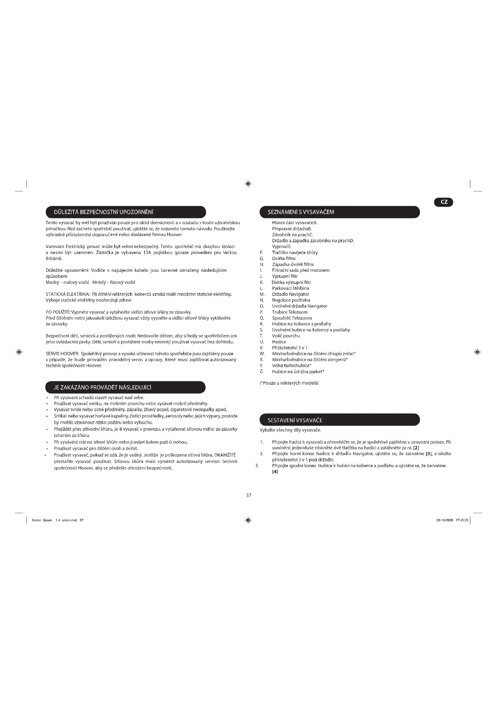 (*Pouze u některých modelů) Vybalte všechny díly vysavače. Připojte hadici k vysavači a přesvědčte se, že je spolehlivě zajištěna v provozní poloze. Při 1. uvolnění: jednoduše stiskněte dvě tlačítka na hadici a zatáhněte za ni. [2] Připojte horní konec hadice k držadlu Navigator, ujistěte se, že zacvakne 2. [3], a uložte příslušenství 3 v 1 pod držadlo. Připojte spodní konec trubice k hubici na koberce a podlahu a ujistěte se, že zacvakne. 3. [4] Při vysávání schodů stavět vysavač nad sebe.• Používat vysavač venku, na mokrém povrchu nebo vysávat mokré předměty.• Vysávat tvrdé nebo ostré předměty, zápalky, žhavý popel, cigaretové nedopalky apod.• Stříkat nebo vysávat hořlavé kapaliny, čisticí prostředky, aerosoly nebo jejich výpary, protože • by mohlo vzniknout riziko požáru nebo výbuchu. Přejíždět přes přívodní šňůru, je-li vysavač v provozu, a vytahovat síťovou vidlici ze zásuvky • taháním za šňůru. Při vysávání stát na síťové šňůře nebo ji ovíjet kolem paží či nohou.• Používat vysavač pro čištění osob a zvířat.• Používat vysavač, pokud se zdá, že je vadný. Jestliže je poškozena síťová šňůra, OKAMŽITĚ • přestaňte vysavač používat. Síťovou šňůru musí vyměnit autorizovaný servisní technik společnosti Hoover, aby se předešlo ohrožení bezpečnosti. Xarion_Green__1-4_union.indd 57 28-10-2009 17:45:25 Z.58