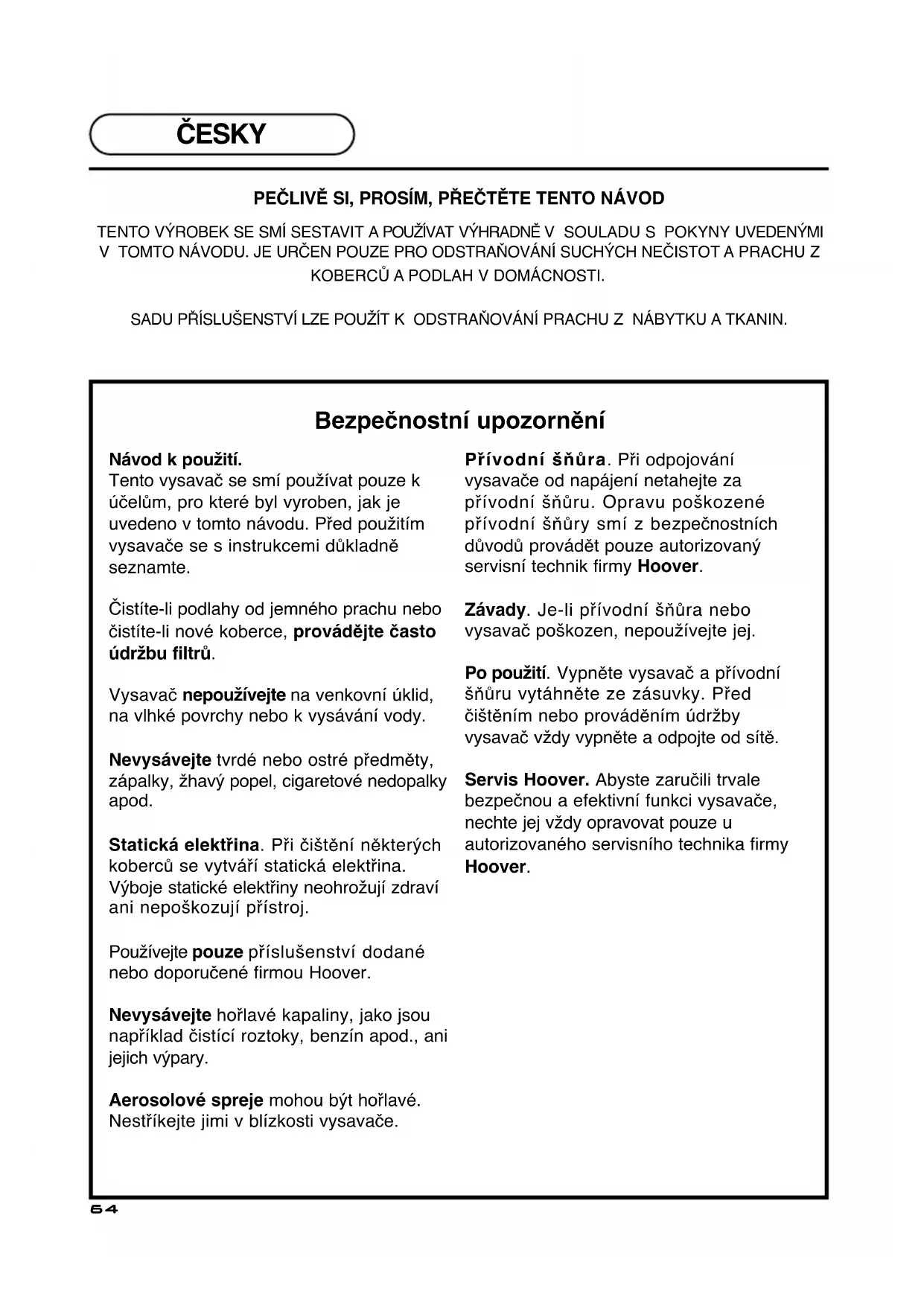 Návod k použití. Tento vysavač se smí používat pouze k účelům, pro které byl vyroben, jak je uvedeno v tomto návodu. Před použitím vysavače se s instrukcemi důkladně seznamte. Čistíte-li podlahy od jemného prachu nebo čistíte-li nové koberce, provádějte často údržbu filtrů. Vysavač nepoužívejte na venkovní úklid, na vlhké povrchy nebo k vysávání vody. Nevysávejte tvrdé nebo ostré předměty, zápalky, žhavý popel, cigaretové nedopalky apod. Statická elektřina. Při čištění některých koberců se vytváří statická elektřina. Výboje statické elektřiny neohrožují zdraví ani nepoškozují přístroj. Používejte pouze příslušenství dodané nebo doporučené firmou Hoover. Nevysávejte hořlavé kapaliny, jako jsou například čistící roztoky, benzín apod., ani jejich výpary. Aerosolové spreje mohou být hořlavé. Nestříkejte jimi v blízkosti vysavače. Přívodní šňůra. Při odpojování vysavače od napájení netahejte za přívodní šňůru. Opravu poškozené přívodní šňůry smí z bezpečnostních důvodů provádět pouze autorizovaný servisní technik firmy Hoover. Závady. Je-li přívodní šňůra nebo vysavač poškozen, nepoužívejte jej. Po použití. Vypněte vysavač a přívodní šňůru vytáhněte ze zásuvky. Před čištěním nebo prováděním údržby vysavač vždy vypněte a odpojte od sítě. Servis Hoover. Abyste zaručili trvale bezpečnou a efektivní funkci vysavače, nechte jej vždy opravovat pouze u autorizovaného servisního technika firmy Hoover. PEČLIVĚ SI, PROSÍM, PŘEČTĚTE TENTO NÁVOD TENTO VÝROBEK SE SMÍ SESTAVIT A POUŽÍVAT VÝHRADNĚ V SOULADU S POKYNY UVEDENÝMI V TOMTO NÁVODU. JE URČEN POUZE PRO ODSTRAŇOVÁNÍ SUCHÝCH NEČISTOT A PRACHU Z KOBERCŮ A PODLAH V DOMÁCNOSTI. SADU PŘÍSLUŠENSTVÍ LZE POUŽÍT K ODSTRAŇOVÁNÍ PRACHU Z NÁBYTKU A TKANIN. Bezpečnostní upozornění65 Požadavky na elektrické napájení TENTO PŘÍSTROJ MÁ DVOJITOU IZOLACI A NESMÍ BÝT UZEMNĚN. DŮLEŽITÉ UPOZORNĚNÍ: VODIČE SÍŤOVÉHO NAPÁJENÍ JSOU OZNAČENY PODLE NÁSLEDUJÍCÍHO KÓDU: MODRÝ – NULOVÝ VODIČ - HNĚDÝ - FÁZE UPOZORNĚNÍ! ELEKTRICKÝ PROUD MŮŽE BÝT VELMI NEBEZPEČNÝ. *Funkce se liší v závislosti na modelu Prodlužovací trubice (1) * Zatlačením západky dopředu odjistěte trubice. Trubici vytáhněte do požadované délky. Uvolněte západku. Nasazení hadice (2) Hadici zasuňte do sacího otvoru vysavače dokud západka hadice nezaklapne. K uvolnění zatlačte západku a hadici vytáhněte. Regulace sání (3) Posunutím záklopky nastavte požadované sání. Hlavní vypínač (4) Stisknutím zapněte vysavač. Opětovným stisknutím jej vypněte. TLAČÍTKO PRO NAVINUTÍ ŠŇŮRY (5) Stiskněte. Odvinutá šňůra se automaticky navine zpět do vysavače.