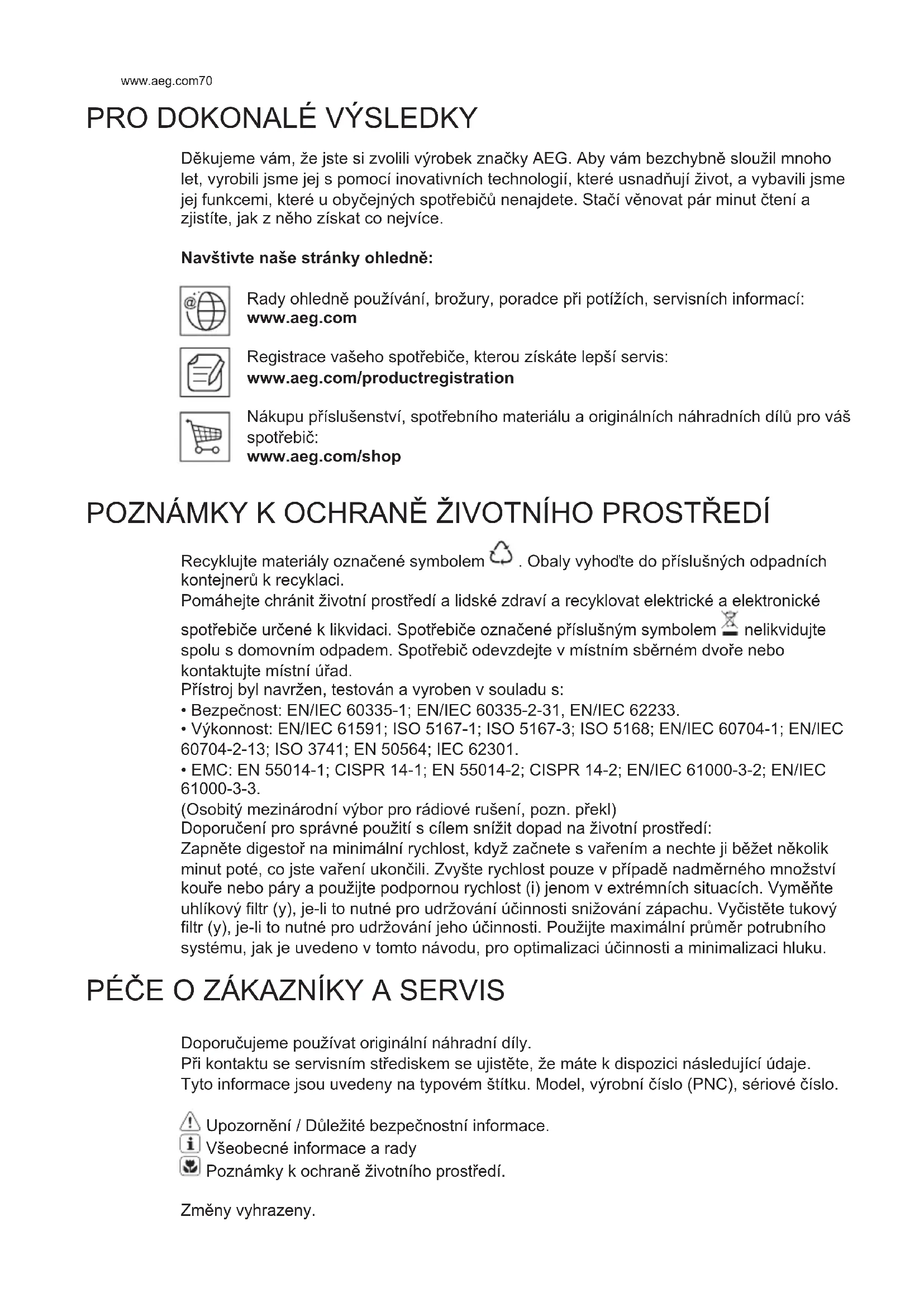 Bármilyen karbantartási munka megkezdése elĪtt szüntesse meg az elszívó áramellátását, kösse ki a hálózatból. Figyelem! MielĪtt a lámpákhoz érne, gyĪzĪdjön meg róla, hidegek-e. Csak 12V - 20W max - G4 halogén égĪket használjon, vigyázzon arra, hogy kézzel ne érjen hozzájuk.www.aeg.com70 DĞkujeme vám, že jste si zvolili výrobek značky AEG. Aby vám bezchybnĞ sloužil mnoho let, vyrobili jsme jej s pomocí inovativních technologií, které usnadĨují život, a vybavili jsme jej funkcemi, které u obyčejných spotĮebičĶ nenajdete. Stačí vĞnovat pár minut čtení a zjistíte, jak z nĞho získat co nejvíce. Navštivte naše stránky ohledně: Rady ohlednĞ používání, brožury, poradce pĮi potížích, servisních informací: www.aeg.com Registrace vašeho spotĮebiče, kterou získáte lepší servis: www.aeg.com/productregistration Nákupu pĮíslušenství, spotĮebního materiálu a originálních náhradních dílĶ pro váš spotĮebič: www.aeg.com/shop