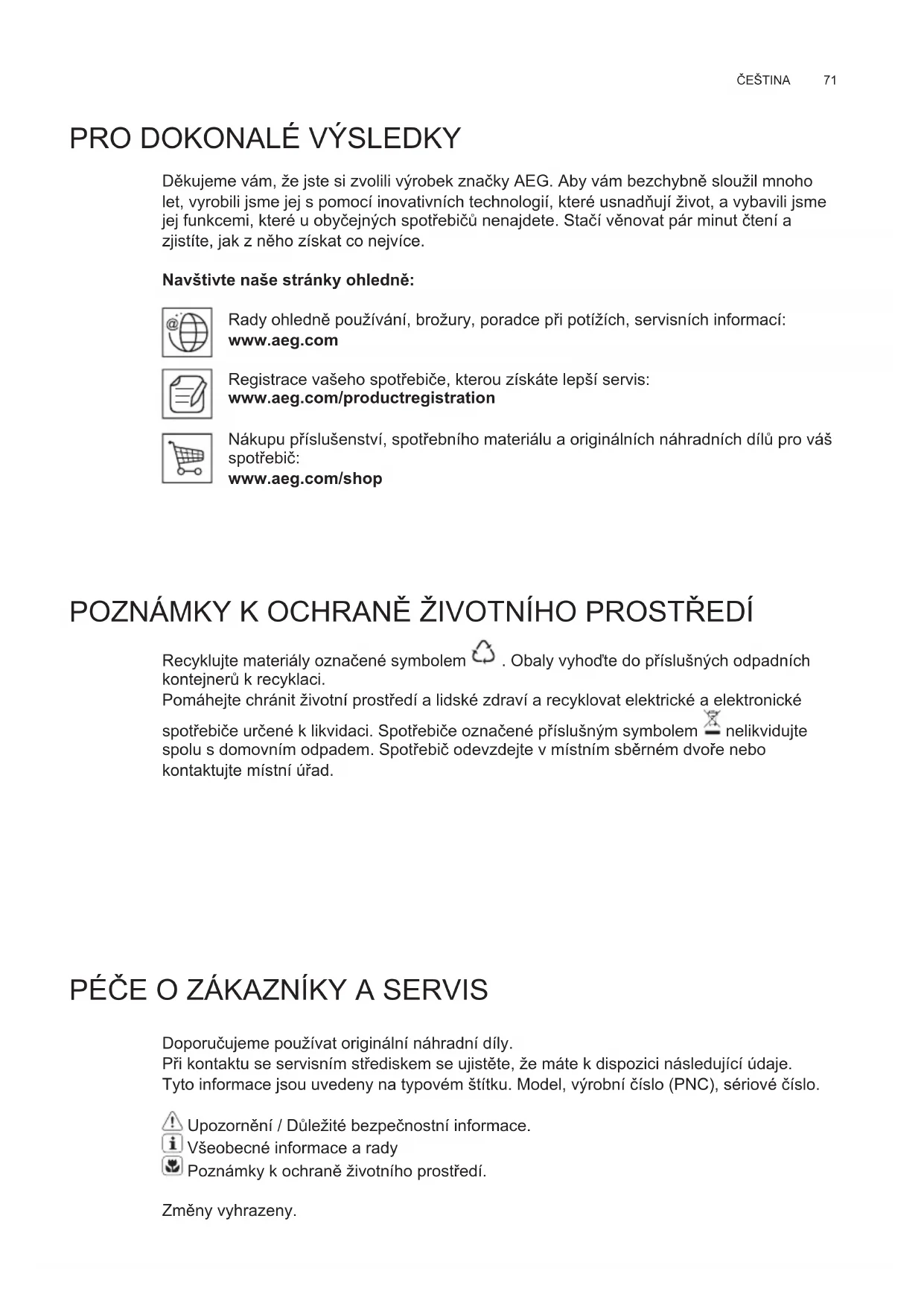 POZNÁMKY K OCHRANĝ ŽIVOTNÍHO PROSTĭEDÍ Recyklujte materiály označené symbolem . Obaly vyhoęte do pĮíslušných odpadních kontejnerĶ k recyklaci. Pomáhejte chránit životní prostĮedí a lidské zdraví a recyklovat elektrické a elektronické spotĮebiče určené k likvidaci. SpotĮebiče označené pĮíslušným symbolem nelikvidujte spolu s domovním odpadem. SpotĮebič odevzdejte v místním sbĞrném dvoĮe nebo kontaktujte místní úĮad. PÉČE O ZÁKAZNÍKY A SERVIS Doporučujeme používat originální náhradní díly. PĮi kontaktu se servisním stĮediskem se ujistĞte, že máte k dispozici následující údaje. Tyto informace jsou uvedeny na typovém štítku. Model, výrobní číslo (PNC), sériové číslo. UpozornĞní / DĶležité bezpečnostní informace. Všeobecné informace a rady Poznámky k ochranĞ životního prostĮedí. ZmĞny vyhrazeny. CS NÁVOD K POUŽITÍwww.aeg.com