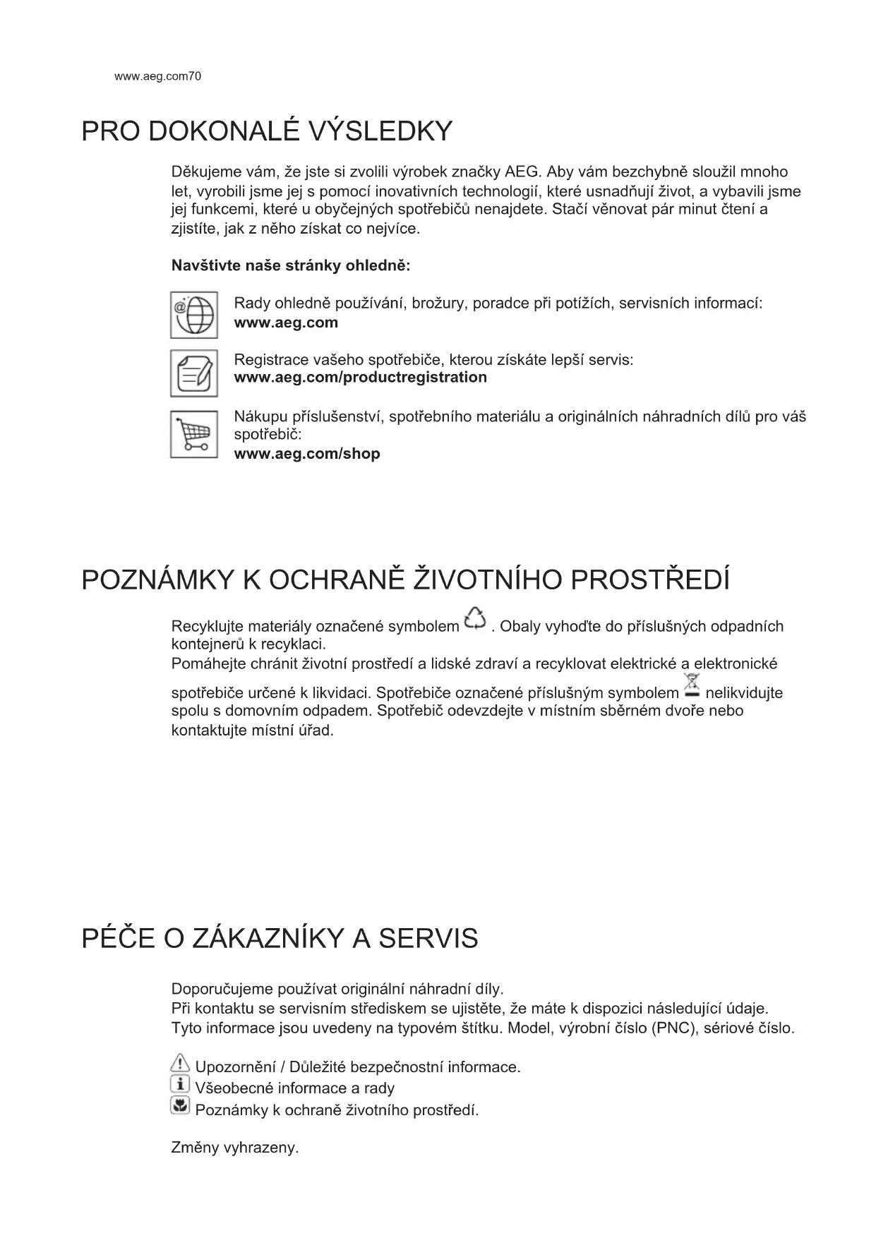 POZNÁMKY K OCHRANĝ ŽIVOTNÍHO PROSTĭEDÍ Recyklujte materiály označené symbolem . Obaly vyhoęte do pĮíslušných odpadních kontejnerĶ k recyklaci. Pomáhejte chránit životní prostĮedí a lidské zdraví a recyklovat elektrické a elektronické spotĮebiče určené k likvidaci. SpotĮebiče označené pĮíslušným symbolem nelikvidujte spolu s domovním odpadem. SpotĮebič odevzdejte v místním sbĞrném dvoĮe nebo kontaktujte místní úĮad. PÉČE O ZÁKAZNÍKY A SERVIS Doporučujeme používat originální náhradní díly. PĮi kontaktu se servisním stĮediskem se ujistĞte, že máte k dispozici následující údaje. Tyto informace jsou uvedeny na typovém štítku. Model, výrobní číslo (PNC), sériové číslo. UpozornĞní / DĶležité bezpečnostní informace. Všeobecné informace a rady Poznámky k ochranĞ životního prostĮedí. ZmĞny vyhrazeny.