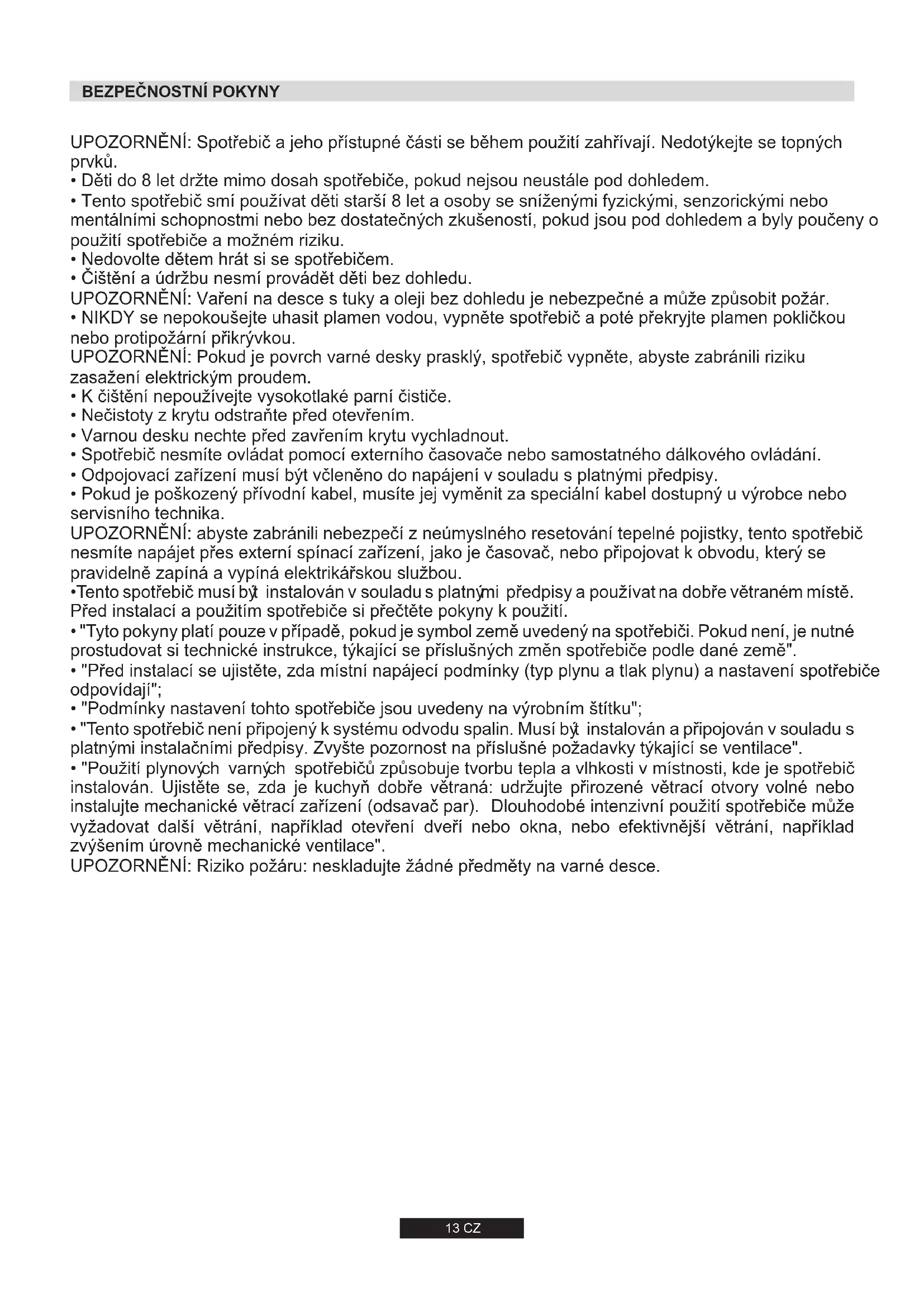 - "Tento spotřebič není připojený k systému odvodu spalin. Musí být instalován a připojován v souladu s platnými instalačními předpisy. Zvyšte pozornost na příslušné požadavky týkající se ventilace".