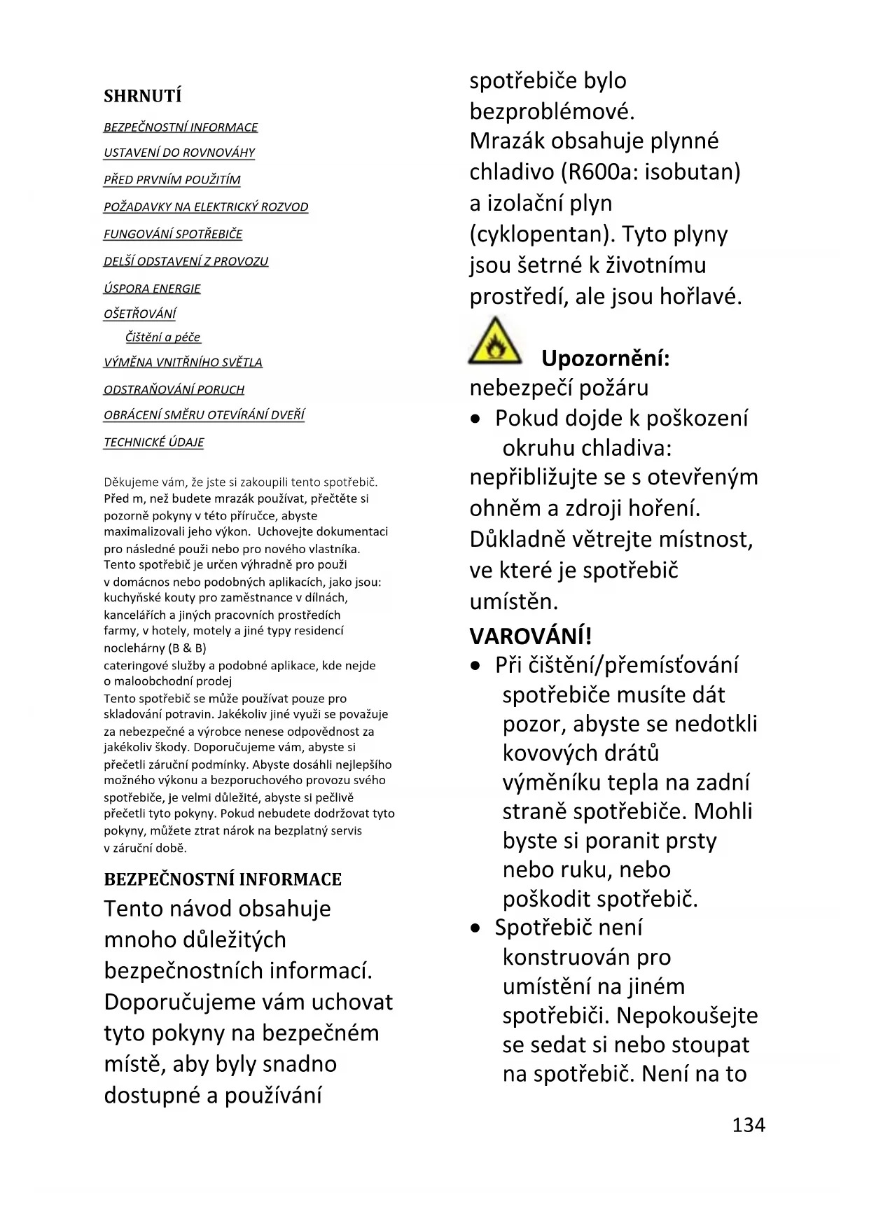 Tento návod obsahuje mnoho důležitých bezpečnostních informací. Doporučujeme vám uchovat tyto pokyny na bezpečném místě, aby byly snadno dostupné a používání spotřebiče bylo bezproblémové. Mrazák obsahuje plynné chladivo (R600a: isobutan) a izolační plyn (cyklopentan). Tyto plyny jsou šetrné k životnímu prostředí, ale jsou hořlavé. Upozornění: nebezpečí požáru