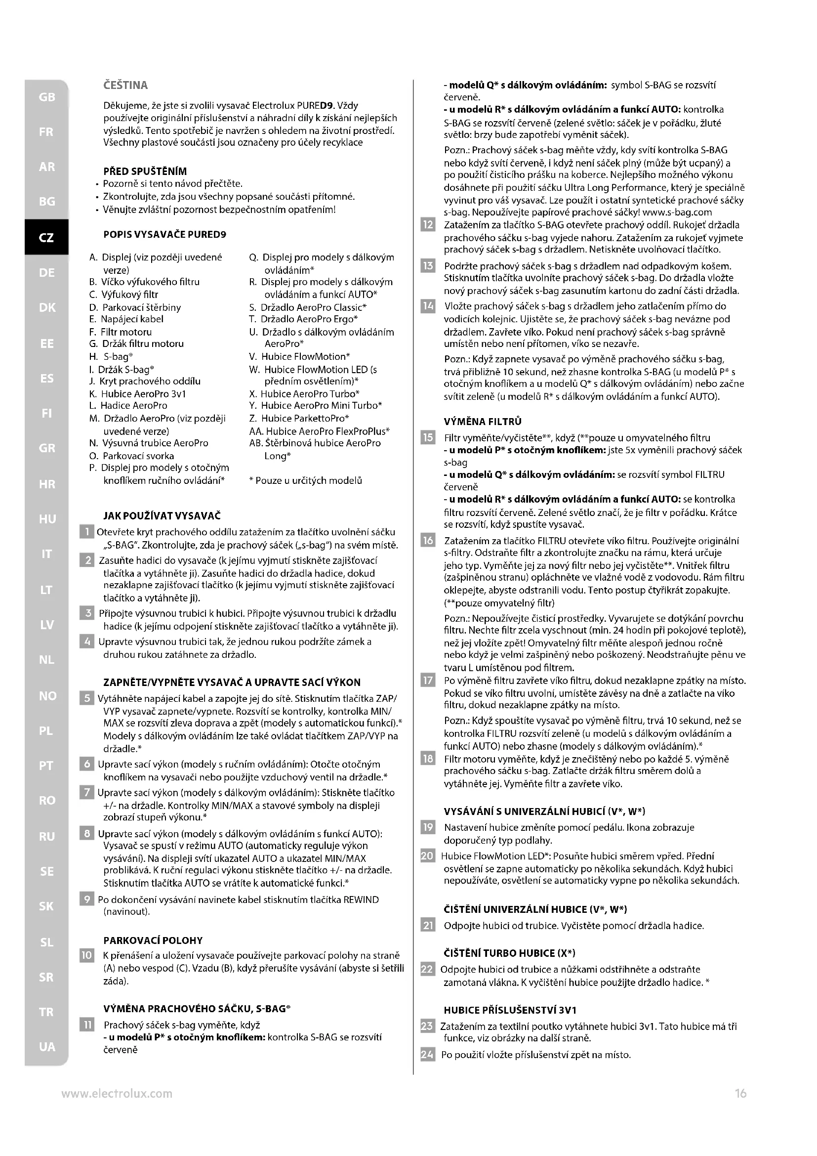 J. Kryt prachového oddílu K. Hubice AeroPro 3v1 L. Hadice AeroPro M. Držadlo AeroPro (viz později uvedené verze) N. Výsuvná trubice AeroPro O. Parkovací svorka P. Displej pro modely s otočným knoíkem ručního ovládání* Q. Displej pro modely s dálkovým ovládáním* R. Displej pro modely s dálkovým ovládáním a funkcí AUTO* S. Držadlo AeroPro Classic* T. Držadlo AeroPro Ergo* U. Držadlo s dálkovým ovládáním AeroPro*