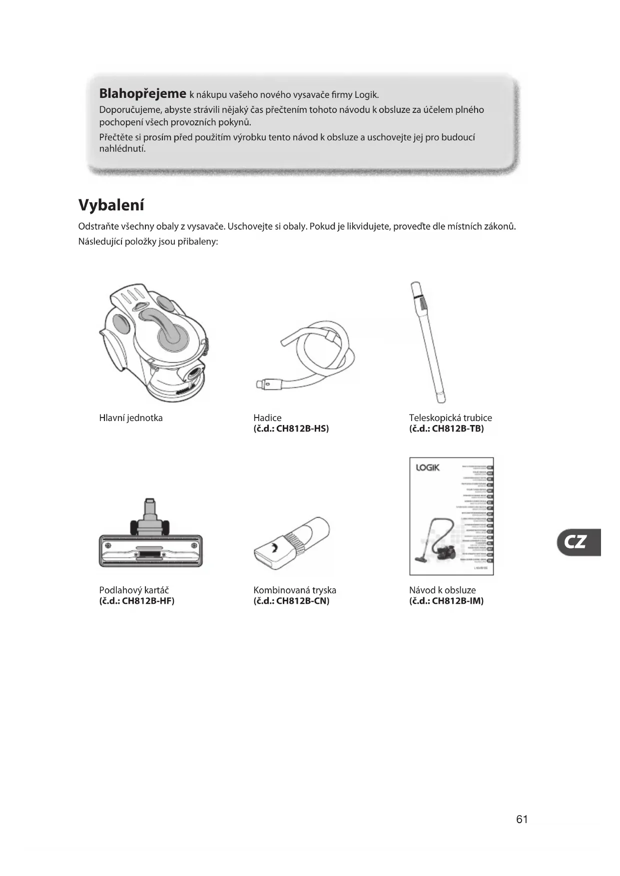 Vybalení Odstraňte všechny obaly z vysavače. Uschovejte si obaly. Pokud je likvidujete, proveďte dle místních zákonů. Následující položky jsou přibaleny: Blahopřejeme k nákupu vašeho nového vysavače rmy Logik. Doporučujeme, abyste strávili nějaký čas přečtením tohoto návodu k obsluze za účelem plného pochopení všech provozních pokynů. Přečtěte si prosím před použitím výrobku tento návod k obsluze a uschovejte jej pro budoucí nahlédnutí. Hlavní jednotka Podlahový kartáč (č.d.: CH812B-HF) Hadice (č.d.: CH812B-HS) Kombinovaná tryska (č.d.: CH812B-CN) Teleskopická trubice (č.d.: CH812B-TB) Návod k obsluze (č.d.: CH812B-IM)62