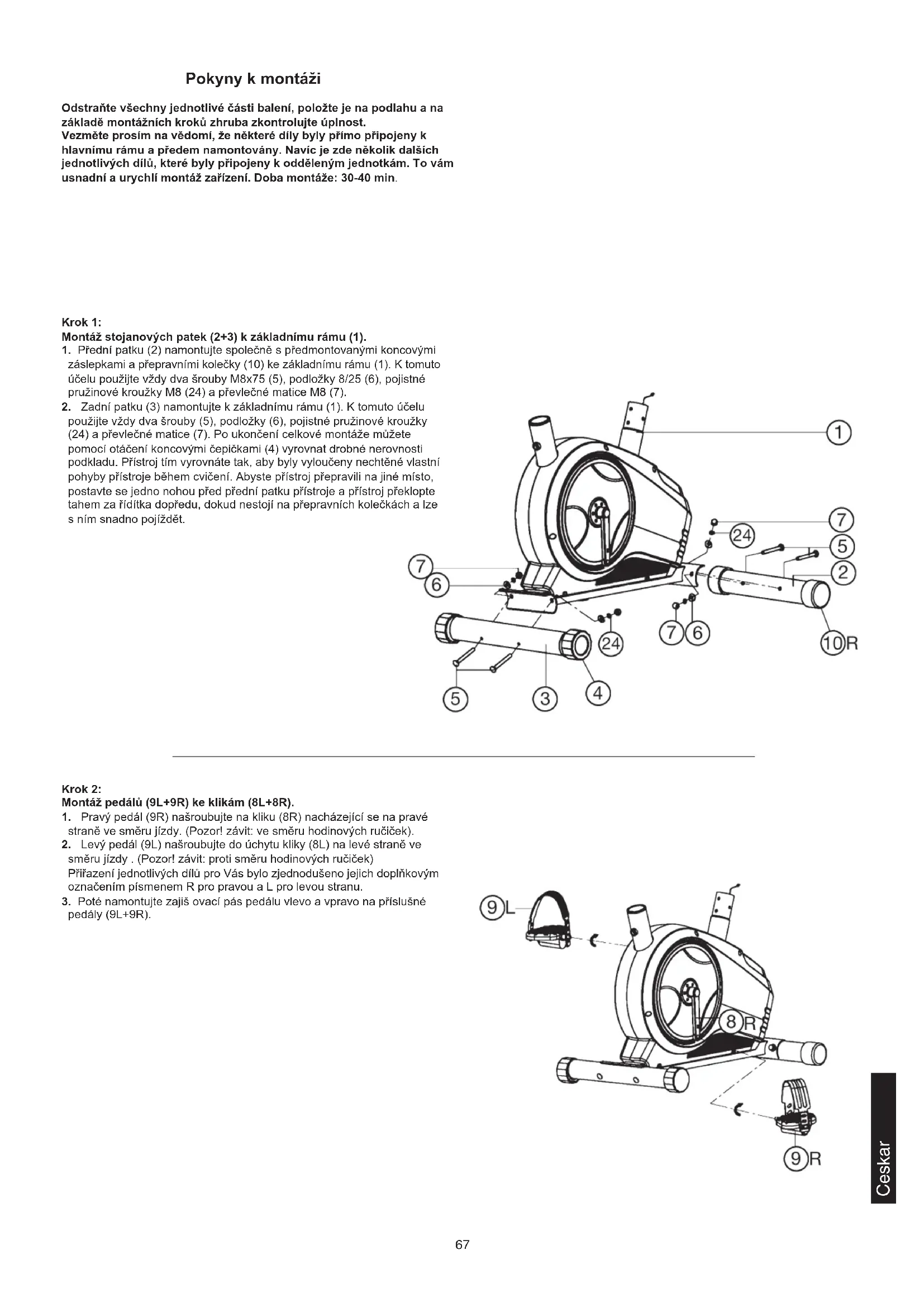 použijte vždy dva šrouby (5), podložky (6), pojistné pružinové kroužky (24) a převlečné matice (7). Po ukončení celkové montáže můžete pomocí otáčení koncovými čepičkami (4) vyrovnat drobné nerovnosti podkladu. Přístroj tím vyrovnáte tak, aby byly vyloučeny nechtěné vlastní pohyby přístroje během cvičení. Abyste přístroj přepravili na jiné místo, postavte se jedno nohou před přední patku přístroje a přístroj překlopte tahem za řídítka dopředu, dokud nestojí na přepravních kolečkách a lze s ním snadno pojíždět. Krok 2: Montáž pedálů (9L+9R) ke klikám (8L+8R).