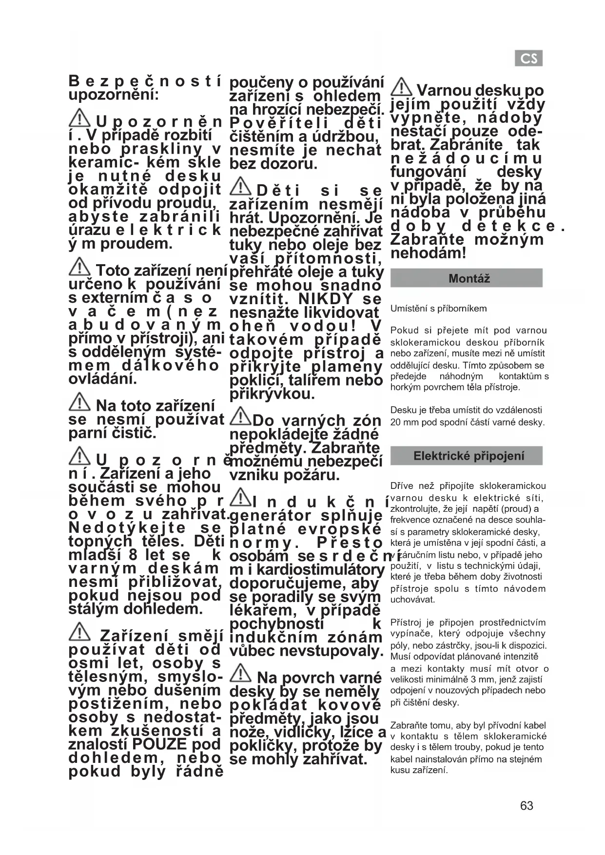 Bezpečností upozornění: U p o z o r n ě n í . V případě rozbití nebo praskliny v keramic- kém skle je nutné desku okamžitě odpojit od přívodu proudu, abyste zabránili úrazu e l e k t r i c k ý m proudem. Toto zařízení není určeno k používání s externím č a s o v a č e m ( n e z a b u d o v a n ý m přímo v přístroji), ani s odděleným systé- mem dálkového ovládání. Na toto zařízení se nesmí používat parní čistič. U p o z o r n ě n í . Zařízení a jeho součásti se mohou během svého p r o v o z u zahřívat. Nedotýkejte se topných těles. Děti mladší 8 let se k varným deskám nesmí přibližovat, pokud nejsou pod stálým dohledem. Zařízení smějí používat děti od osmi let, osoby s tělesným, smyslo- vým nebo dušením postižením, nebo osoby s nedostat- kem zkušeností a znalostí POUZE pod dohledem, nebo pokud byly řádně poučeny o používání zařízení s ohledem na hrozící nebezpečí. Pověříteli děti čištěním a údržbou, nesmíte je nechat bez dozoru. Děti si se zařízením nesmějí hrát. Upozornění. Je nebezpečné zahřívat tuky nebo oleje bez vaší přítomnosti, přehřáté oleje a tuky se mohou snadno vznítit. NIKDY se nesnažte likvidovat oheň vodou! V takovém případě odpojte přístroj a přikryjte plameny poklicí, talířem nebo přikrývkou. Do varných zón nepokládejte žádné předměty. Zabraňte možnému nebezpečí vzniku požáru. I n d u k č n í generátor splňuje platné evropské normy. Přesto osobám se s r d e č n í m i kardiostimulátory doporučujeme, aby se poradily se svým lékařem, v případě pochybností k indukčním zónám vůbec nevstupovaly. Na povrch varné desky by se neměly pokládat kovové předměty, jako jsou nože, vidličky, lžíce a pokličky, protože by se mohly zahřívat. Varnou desku po jejím použití vždy vypněte, nádoby nestačí pouze ode- brat. Zabráníte tak n e ž á d o u c í m u fungování desky v případě, že by na ni byla položena jiná nádoba v průběhu doby detekce. Zabraňte možným nehodám! Montáž Umístění s příborníkem Pokud si přejete mít pod varnou sklokeramickou deskou příborník nebo zařízení, musíte mezi ně umístit oddělující desku. Tímto způsobem se předejde náhodným kontaktům s horkým povrchem těla přístroje. Desku je třeba umístit do vzdálenosti 20 mm pod spodní částí varné desky. Elektrické připojení Dříve než připojíte sklokeramickou varnou desku k elektrické síti, zkontrolujte, že její napětí (proud) a frekvence označené na desce souhla- sí s parametry sklokeramické desky, která je umístěna v její spodní části, a v záručním listu nebo, v případě jeho použití, v listu s technickými údaji, které je třeba během doby životnosti přístroje spolu s tímto návodem uchovávat. Přístroj je připojen prostřednictvím vypínače, který odpojuje všechny póly, nebo zástrčky, jsou-li k dispozici. Musí odpovídat plánované intenzitě a mezi kontakty musí mít otvor o velikosti minimálně 3 mm, jenž zajistí odpojení v nouzových případech nebo při čištění desky. Zabraňte tomu, aby byl přívodní kabel v kontaktu s tělem sklokeramické desky i s tělem trouby, pokud je tento kabel nainstalován přímo na stejném kusu zařízení.CS