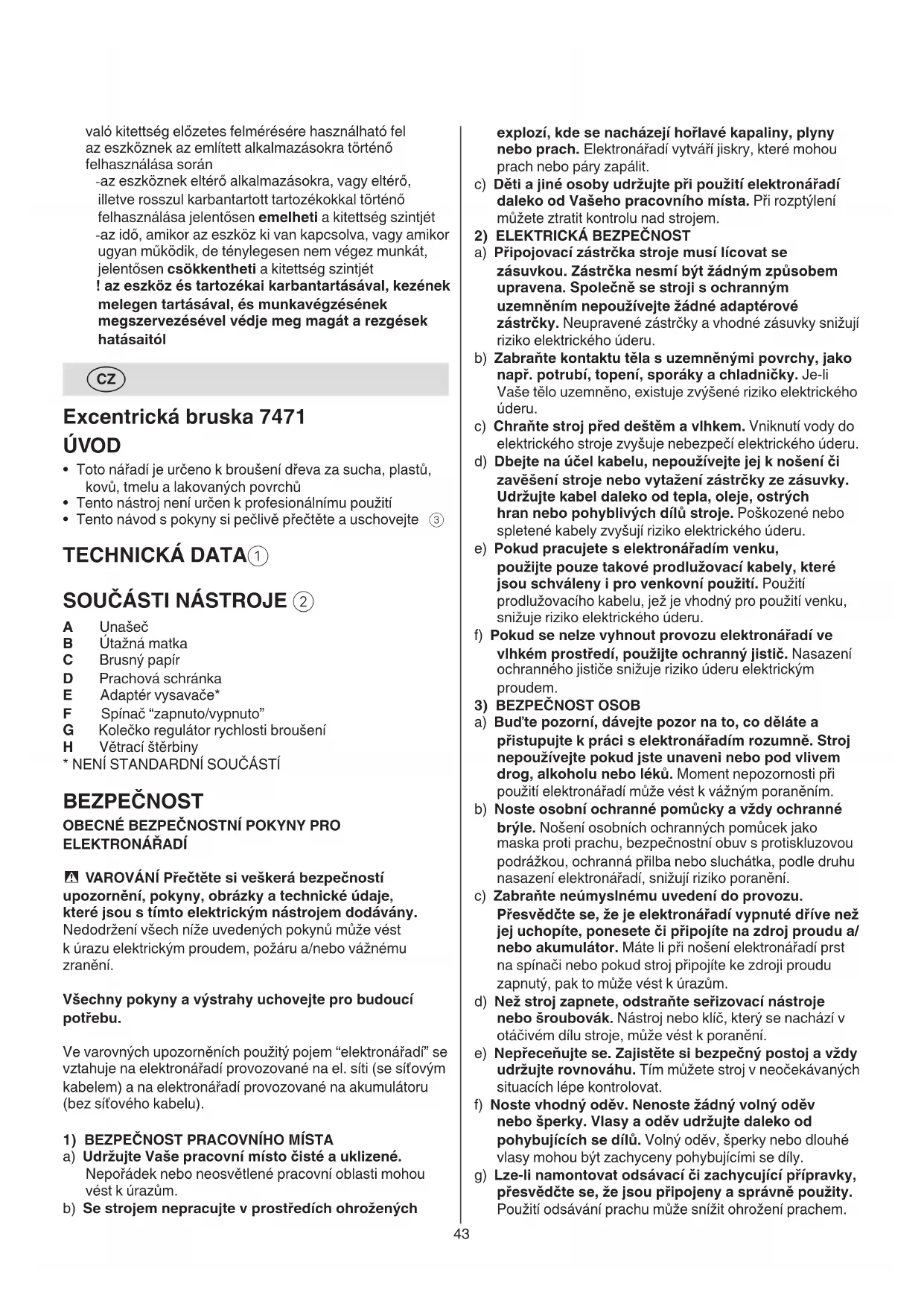 ! munka közben mindvégig tartsa gépet a szürke színű markolati terület(ek)en - a gépet tartsa párhuzamosan a megmunkálandó felülettel - ne gyakoroljon túl nagy nyomást a gépre; hagyja azt egyedül dolgozni43 explozí, kde se nacházejí hořlavé kapaliny, plyny nebo prach. Elektronářadí vytváří jiskry, které mohou prach nebo páry zapálit. c) Děti a jiné osoby udržujte při použití elektronářadí daleko od Vašeho pracovního místa. Při rozptýlení můžete ztratit kontrolu nad strojem.