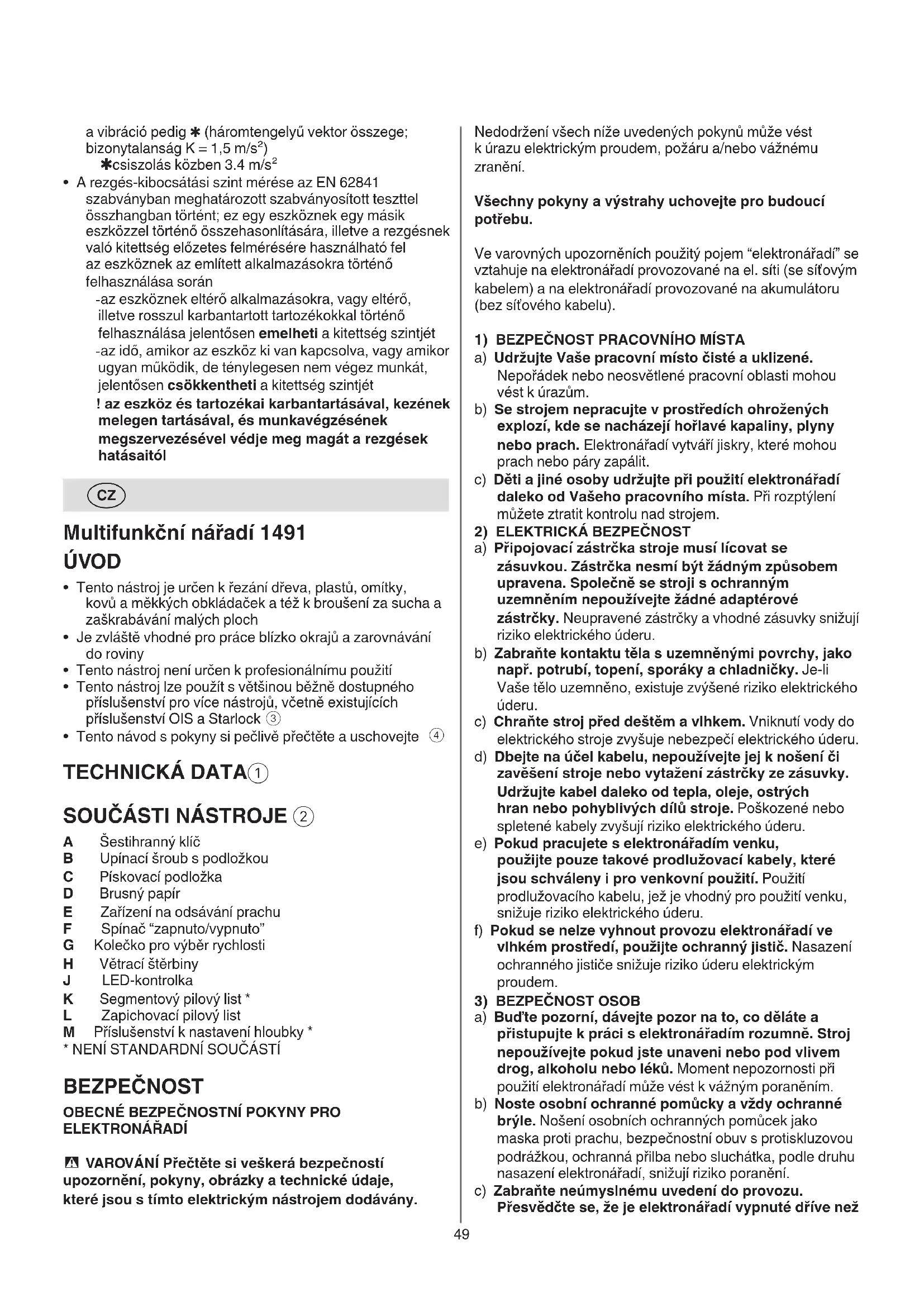 ELEKTRONÁŘADÍ - VAROVÁNÍ Přečtěte si veškerá bezpečností upozornění, pokyny, obrázky a technické údaje, které jsou s tímto elektrickým nástrojem dodávány.50 BEZPEČNOSTNÍ POKYNY PRO MULTIFUNKČNÍ NÁŘADÍ OBECNĚ