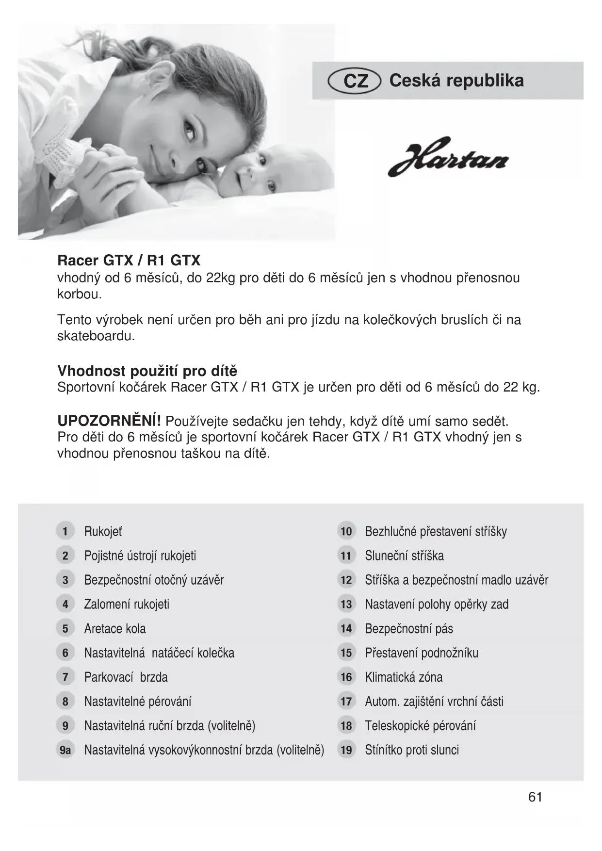 Racer GTX / R1 GTX vhodný od 6 měsíců, do 22kg pro děti do 6 měsíců jen s vhodnou přenosnou korbou. Tento výrobek není určen pro běh ani pro jízdu na kolečkových bruslích či na skateboardu. Rukojeť Pojistné ústrojí rukojeti Bezpečnostní otočný uzávěr Zalomení rukojeti Aretace kola Nastavitelná natáčecí kolečka Parkovací brzda Nastavitelné pérování Nastavitelná ruční brzda (volitelně) Nastavitelná vysokovýkonnostní brzda (volitelně) Bezhlučné přestavení stříšky Sluneční stříška Stříška a bezpečnostní madlo uzávěr Nastavení polohy opěrky zad Bezpečnostní pás Přestavení podnožníku Klimatická zóna Autom. zajištění vrchní části Teleskopické pérování Stínítko proti slunci