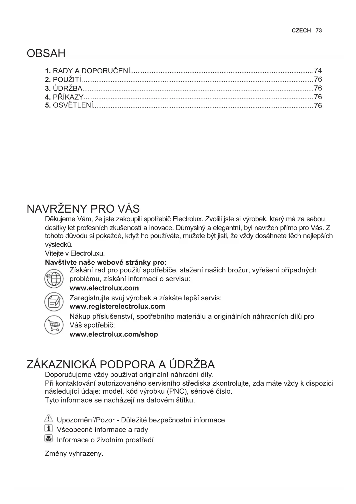Doporučujeme vždy používat originální náhradní díly. Při kontaktování autorizovaného servisního střediska zkontrolujte, zda máte vždy k dispozici následující údaje: model, kód výrobku (PNC), sériové číslo. Tyto informace se nacházejí na datovém štítku. Upozornění/Pozor - Důležité bezpečnostní informace Všeobecné informace a rady Informace o životním prostředí Změny vyhrazeny.74 www.electrolux.com