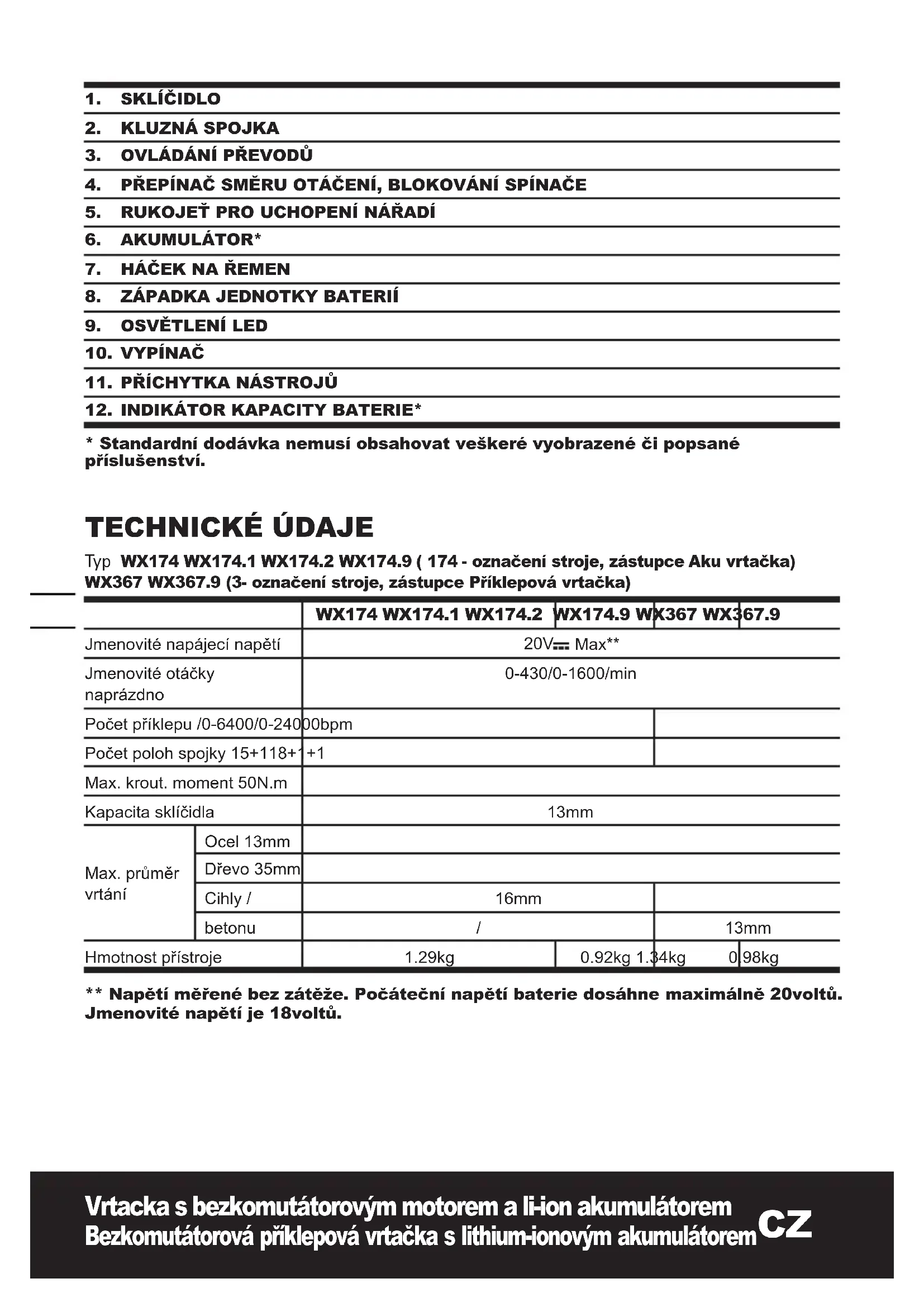Vrtacka s bezkomutátorovým motorem a li-ion akumulátorem Bezkomutátorová příklepová vrtačka s lithium-ionovým akumulátorem TECHNICKÉ ÚDAJE Typ WX174 WX174.1 WX174.2 WX174.9 ( 174 - označení stroje, zástupce Aku vrtačka) WX367 WX367.9 (3- označení stroje, zástupce Příklepová vrtačka) WX174 WX174.1 WX174.2 WX174.9 WX367 WX367.9 Jmenovité napájecí napětí 20V Max** Jmenovité otáčky naprázdno 0-430/0-1600/min Počet příklepu / 0-6400/0-24000bpm Počet poloh spojky 15+1 18+1+1 Max. krout. moment 50N.m Kapacita sklíčidla 13mm Max. průměr vrtání Ocel 13mm Dřevo 35mm Cihly / 16mm betonu / 13mm Hmotnost přístroje 1.29kg 0.92kg 1.34kg 0.98kg ** Napětí měřené bez zátěže. Počáteční napětí baterie dosáhne maximálně 20voltů. Jmenovité napětí je 18voltů.