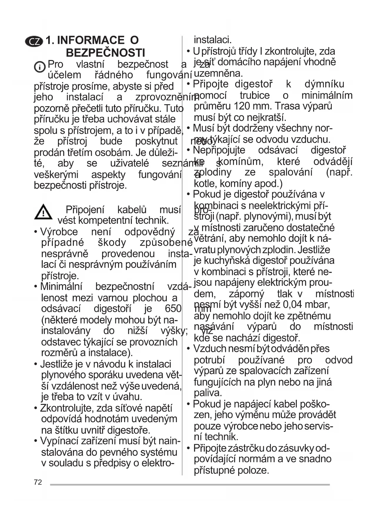 - Nepřipojujte odsávací digestoř ke komínům, které odvádějí zplodiny ze spalování (např. kotle,komínyapod.)