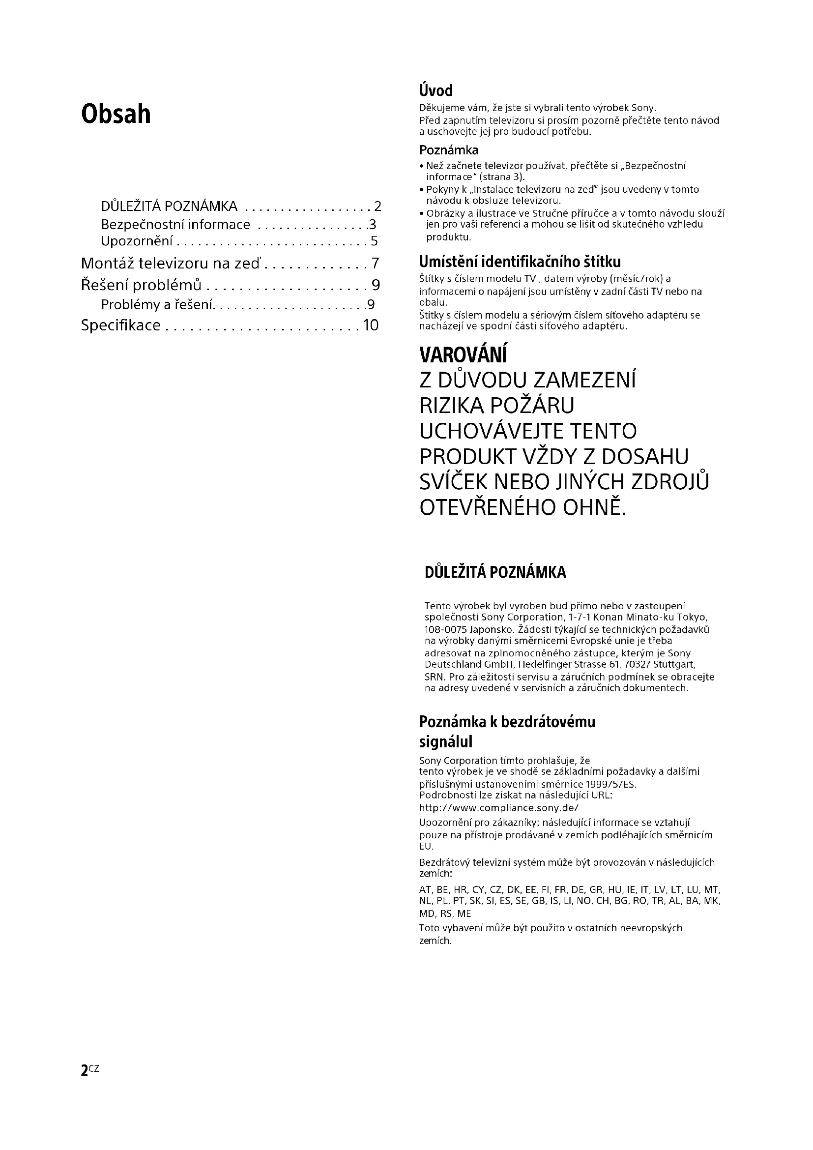 - Specifikace Úvod Děkujeme vám, že jste si vybrali tento výrobek Sony. Před zapnutím televizoru si prosím pozorně přečtěte tento návod a uschovejte jej pro budoucí potřebu.Poznámka• Než začnete televizor používat, přečtěte si „Bezpečnostní informace“ (strana 3). p. 10