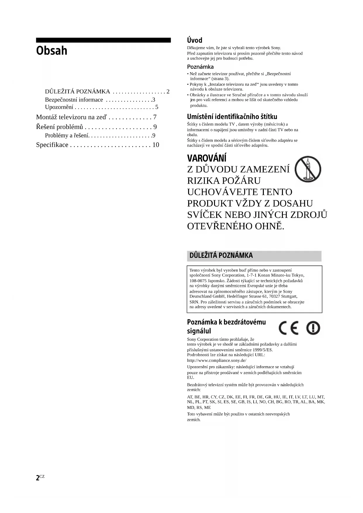 - Specifikace Úvod Děkujeme vám, že jste si vybrali tento výrobek Sony. Před zapnutím televizoru si prosím pozorně přečtěte tento návod a uschovejte jej pro budoucí potřebu.Poznámka• Než začnete televizor používat, přečtěte si „Bezpečnostní informace“ (strana 3). p. 10