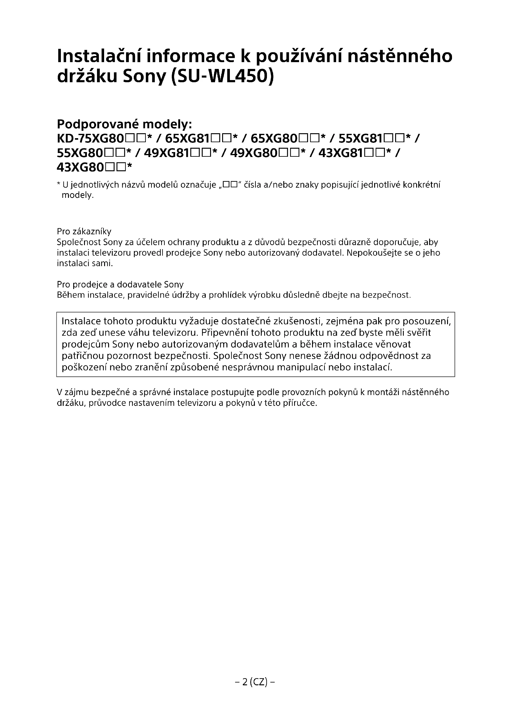 Nasledujici pouny jsou urceny pouze pro prodejce spolecnosti Sony.Proctete siVyse uvedene pouny a behem montaze,udrzby a kontroy tohoto produktu venujte zvysenou pozornost bezpecnosti.