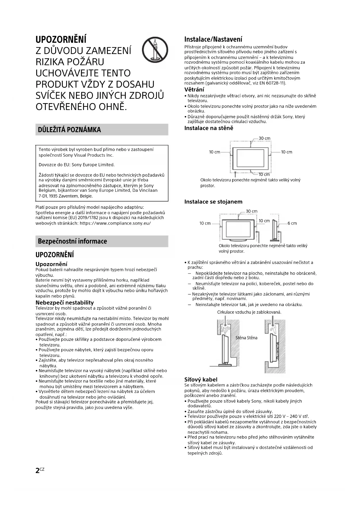 - Síťový kabel musí být instalovaný v dostatečné vzdálenosti od tepelných zdrojů. Tento výrobek byl vyroben buď přímo nebo v zastoupení společností Sony Visual Products Inc. Dovozce do EU: Sony Europe Limited. Žádosti týkající se dovozce do EU nebo technických požadavků na výrobky danými směrnicemi Evropské unie je třeba adresovat na zplnomocněného zástupce, kterým je Sony Belgium, bijkantoor van Sony Europe Limited, Da Vincilaan 7-D1, 1935 Zaventem, Belgie. 30 cm 10 cm 10 cm Okolo televizoru ponechte nejméně takto veliký volný prostor. 10 cm Okolo televizoru ponechte nejméně takto veliký volný prostor. 30 cm 10 cm 10 cm 6 cm Cirkulace vzduchu je zablokovaná. Stěna StěnaC:\Users\CHAILING_2\Desktop\4746858131\4746858131_13CZ.fm master page: Right