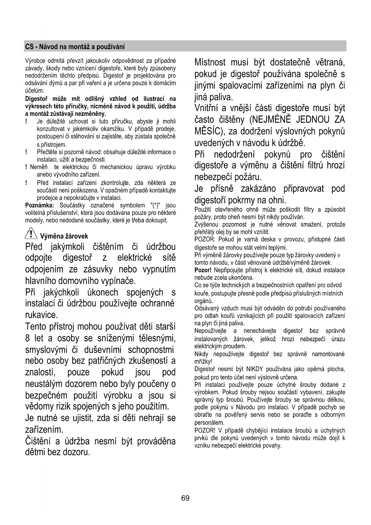 Ако ел. крушките не светят, проверете дали са монтирани правилно преди да потърсите помощта на специалист. - Модел с LED лампи Аспираторът разполага с осветителна система със СВЕТОДИОДИ. СВЕТОДИОДИТЕ гарантират оптимално осветление, до 10 пъти по-силно от традиционните лампи и позволяват 90% икономия на електроенергия. За подмяна се обърнете към сервиза за техническо обслужване.69 CS - Návod na montáž a používání Výrobce odmítá převzít jakoukoliv odpovědnost za případné závady, škody nebo vznícení digestoře, které byly způsobeny nedodržením těchto předpisů. Digestoř je projektována pro odsávání dýmů a par při vaření a je určena pouze k domácím účelům. Digestoř může mít odlišný vzhled od ilustrací na výkresech této příručky, nicméně návod k použití, údržba a montáž zůstávají nezměněny. ! Je důležité uchovat si tuto příručku, abyste ji mohli konzultovat v jakémkoliv okamžiku. V případě prodeje, postoupení či stěhování si zajistěte, aby zůstala společně s přístrojem. ! Přečtěte si pozorně návod: obsahuje důležité informace o instalaci, užití a bezpečnosti. ! Neměň te elektrickou či mechanickou úpravu výrobku anebo vývodního zařízení. ! Před instalací zařízení zkontrolujte, zda některá ze součástí není poškozena. V opačném případě kontaktujte prodejce a nepokračujte v instalaci. Poznámka: Součástky označené symbolem "(*)" jsou volitelná příslušenství, která jsou dodávána pouze pro některé modely, nebo nedodané součástky, které je třeba dokoupit. Výměna žárovek Před jakýmkoli čištěním či údržbou odpojte digestoř z elektrické sítě odpojením ze zásuvky nebo vypnutím hlavního domovního vypínače. Při jakýchkoli úkonech spojených s instalací či údržbou používejte ochranné rukavice. Tento přístroj mohou používat děti starší 8 let a osoby se sníženými tělesnými, smyslovými či duševními schopnostmi nebo osoby bez patřičných zkušeností a znalostí, pouze pokud jsou pod neustálým dozorem nebo byly poučeny o bezpečném použití výrobku a jsou si vědomy rizik spojených s jeho použitím. Je nutné se ujistit, zda si děti nehrají se zařízením. Čištění a údržba nesmí být prováděna dětmi bez dozoru. Místnost musí být dostatečně větraná, pokud je digestoř používána společně s jinými spalovacími zařízeními na plyn či jiná paliva. Vnitřní a vnější části digestoře musí být často čištěny (NEJMÉNĚ JEDNOU ZA MĚSÍC), za dodržení výslovných pokynů uvedených v návodu k údržbě. Při nedodržení pokynů pro čištění digestoře a výměnu a čištění filtrů hrozí nebezpečí požáru. Je přísně zakázáno připravovat pod digestoří pokrmy na ohni. Použití otevřeného ohně může poškodit filtry a způsobit požáry, proto oheň nesmí být nikdy používán. Zvýšenou pozornost je nutné věnovat smažení, protože přehřátý olej by se mohl vznítit. POZOR: Pokud je varná deska v provozu, přístupné části digestoře se mohou stát velmi teplými. Při výměně žárovky používejte pouze typ žárovky uvedený v tomto návodu, v části věnované údržbě/výměně žárovek. Pozor! Nepřipojujte přístroj k elektrické síti, dokud instalace nebude zcela ukončena. Co se týče technických a bezpečnostních opatření pro odvod kouře, postupujte přesně podle předpisů příslušných místních orgánů. Odsávaný vzduch musí být odváděn do potrubí používaného pro odtah kouřů vznikajících při použití spalovacích zařízení na plyn či jiná paliva. Nepoužívejte a nenechávejte digestoř bez správně instalovaných žárovek, jelikož hrozí nebezpečí úrazu elektrickým proudem. Nikdy nepoužívejte digestoř bez správně namontované mřížky! Digestoř nesmí být NIKDY používána jako opěrná plocha, pokud pro tento účel není výslovně určena. Při instalaci používejte pouze úchytné šrouby dodané z výrobkem. Pokud šrouby nejsou součástí vybavení, zakupte správný typ šroubů. Používejte šrouby se správnou délkou, podle pokynů v Návodu pro instalaci. V případě pochyb se obraťte na pověřený servis nebo se poraďte s odborným personálem. POZOR! V případě chybějící instalace šroubů a úchytných prvků dle pokynů uvedených v tomto návodu může dojít k vzniku nebezpečí elektrické povahy.70 Tento spotřebič je označený v souladu s evropskou směrnicí 2012/19/EC o likvidaci elektrického a elektronického zařízení (WEEE). Zajištěním správné likvidace tohoto výrobku pomůžete zabránit případným negativním důsledkům na životní prostředí a lidské zdraví, ke kterým by nevhodnou likvidací tohoto výrobku mohlo dojít. Symbol na výrobku nebo na dokumentech přiložených k výrobku udává, že tento spotřebič nepatří do domácího odpadu. Spotřebič je nutné odvézt do sběrného místa pro recyklaci elektrického a elektronického zařízení. Likvidace musí být provedena v souladu s místními předpisy o ochraně životního prostředí, které se týkají likvidace odpadu. Podrobnější informace o zpracování, rekuperaci a recyklaci tohoto výrobku zjistíte u příslušného místního úřadu, služby pro likvidaci domovního odpadu nebo v obchodě, kde jste výrobek zakoupili. Přístroj byl navržen, testován a vyroben v souladu s: