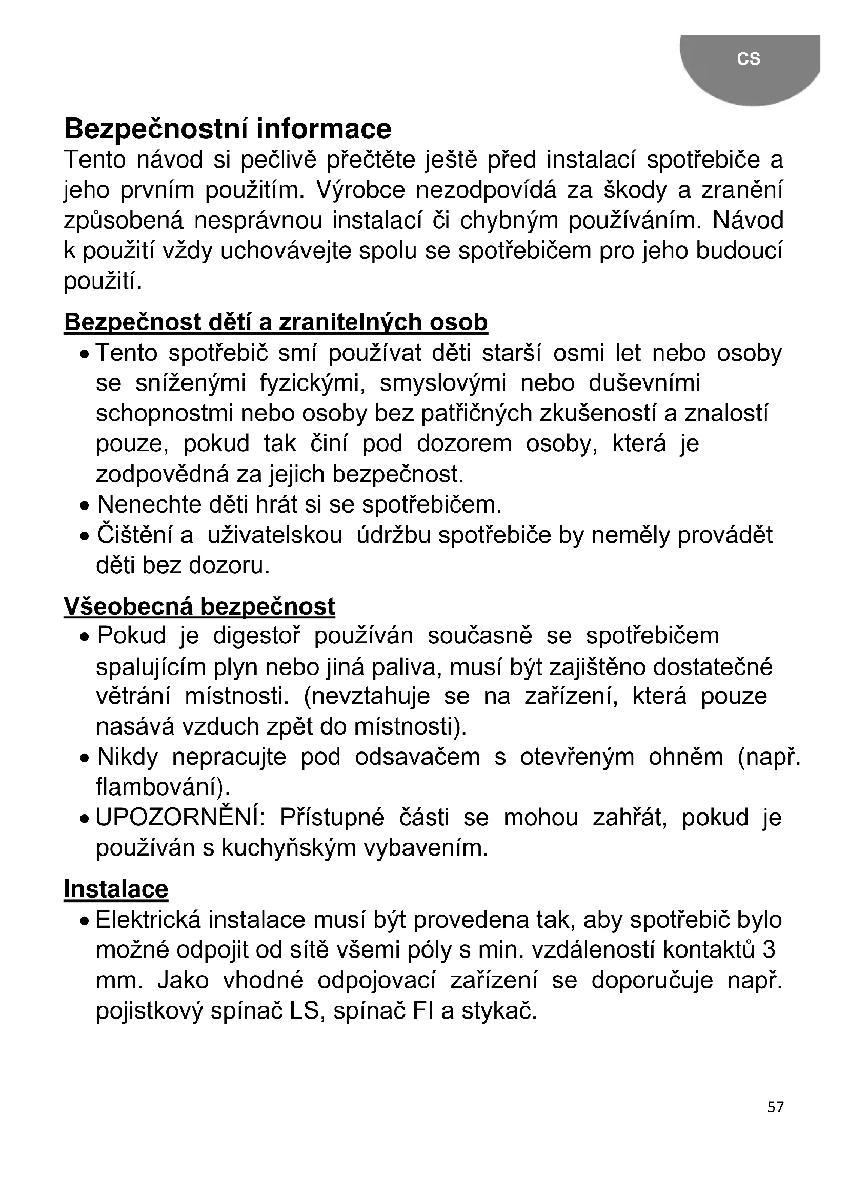 Bezpečnostní informace Tento návod si pečlivě přečtěte ještě před instalací spotřebiče a jeho prvním použitím. Výrobce nezodpovídá za škody a zranění způsobená nesprávnou instalací či chybným používáním. Návod k použití vždy uchovávejte spolu se spotřebičem pro jeho budoucí použití. Bezpečnost dětí a zranitelných osob Tento spotřebič smí používat děti starší osmi let nebo osoby se sníženými fyzickými, smyslovými nebo duševními schopnostmi nebo osoby bez patřičných zkušeností a znalostí pouze, pokud tak činí pod dozorem osoby, která je zodpovědná za jejich bezpečnost. Nenechte děti hrát si se spotřebičem. Čištění a uživatelskou údržbu spotřebiče by neměly provádět děti bez dozoru. Všeobecná bezpečnost Pokud je digestoř používán současně se spotřebičem spalujícím plyn nebo jiná paliva, musí být zajištěno dostatečné větrání místnosti. (nevztahuje se na zařízení, která pouze nasává vzduch zpět do místnosti). Nikdy nepracujte pod odsavačem s otevřeným ohněm (např. flambování). UPOZORNĚNÍ: Přístupné části se mohou zahřát, pokud je používán s kuchyňským vybavením. Instalace Elektrická instalace musí být provedena tak, aby spotřebič bylo možné odpojit od sítě všemi póly s min. vzdáleností kontaktů 3 mm. Jako vhodné odpojovací zařízení se doporučuje např. pojistkový spínač LS, spínač FI a stykač.58 Pokud se elektrické připojení provádí prostřednictvím zástrčky a zůstává po instalaci přístupné, není nutné zajistit uvedené oddělovací zařízení. Odsávané páry nesmí být vypouštěny do komína, který je používán pro odsávání splodin a kouře ze zařízení spalujících plyn nebo jiná paliva (nevztahuje se na zařízení, která pouze nasává vzduch zpět do místnosti). Spodní část kuchyňského odsavače musí být upevněna nejméně 60 cm nad deskou elektrického vařiče a 65 cm nad deskou plynového nebo kombinovaného vařiče. (Pokud je uvedena větší vzdálenost plynových hořáků, je třeba ji dodržet). Prosíme Vás, abyste se seznámili s příslušnými vyhláškami a předpisy, které se týkají elektrické instalace a plynového vedení. Pokud je digestoř v provozu současně s jinými neelektrickými spotřebiči nebo zařízeními, odsávání vzduchu (podtlakové) nesmí být vyšší než 4Pa (4x10