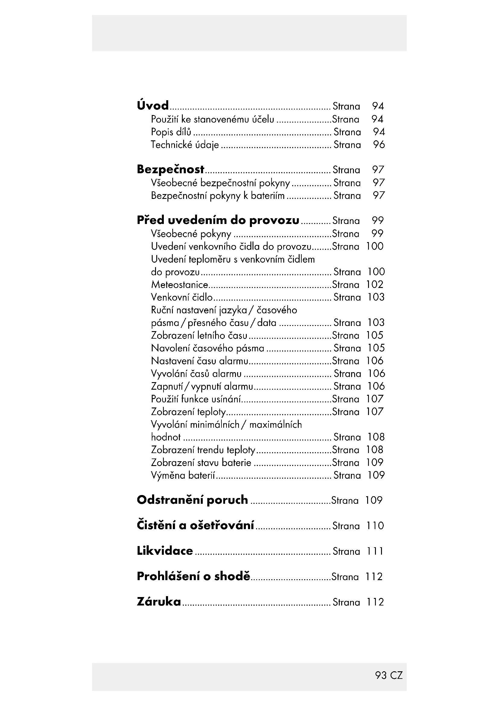 Vyjměte opotřebované baterie. Vložte dvě nové baterie 1,5 V (AA) do schránky na baterie. Upozornění: Dbejte na správnou pola- ritu. Polarita je znázorněna v přihrádkách na baterie (viz též obr. B + D). Zavřete schránku na baterie. Odstranění poruch Upozornění: Zařízení obsahuje elektro- nické konstrukční díly. Neumisťujte zařízení do blízkosti rušivých zdrojů, jako jsou mobilní telefony, radiová zařízení, CB rádia, dálkové ovladače nebo mikrovlnné trouby atd. Jestliže ukazuje displej poruchu, od- straňte přístroje, které jsou příčinou rušení z dosahu stanice nebo venkovního čidla anebo vyjměte krátce baterie ze stanice nebo čidla.110 CZ Překážky, jako například betonové stěny, mo- hou vést ke znatelnému rušení příjmu. V tomto případě zvolte jiné stanoviště (např. v blízkosti okna). Dbejte na umístění venkovního čidla v okruhu maximálně 30 m (volný prostor) od základní stanice. Udaný dosah je podmíněný volným prostorem, mezi venkovním čidlem a základní stanicí se nesmí nacházet žádná pře- kážka. „Přímá viditelnost“ základní stanice a venkovního čidla často zlepší přenos signálů. Nízké teploty (venkovní teplota pod 0 °C) mohou negativně ovlivnit kapacitu baterií a tím i přenos rádiového signálu. Dalším faktorem způsobujícím poruchy příjmu jsou vybité nebo slabé baterie venkovního či- dla. V tomto případě vyměňte baterie za nové. Jestliže stanice teploměru správně nefunguje, vyjměte krátce její baterie a znovu je nasaďte. Čistění a ošetřování Zařízení čistěte jen zvenku měkkou su- chou tkaninou. Nikdy neostřikujte venkovní čidlo, např. zahradní hadicí. Venkovní čidlo je chrá- něno jen proti dešti.111 CZ Likvidace Obal se skládá z ekologicky vhodných mate- riálů, které můžete zlikvidovat v místních recy- klačních střediscích. Informujte se o možnostech odstranění použi- tého výrobku do odpadu u vaší místní obecní nebo městské správy. Neodhazujte použitý výrobek v zájmu ochrany životního prostředí do domovního odpadu. Zajistěte jeho odbornou likvidaci do tříděné