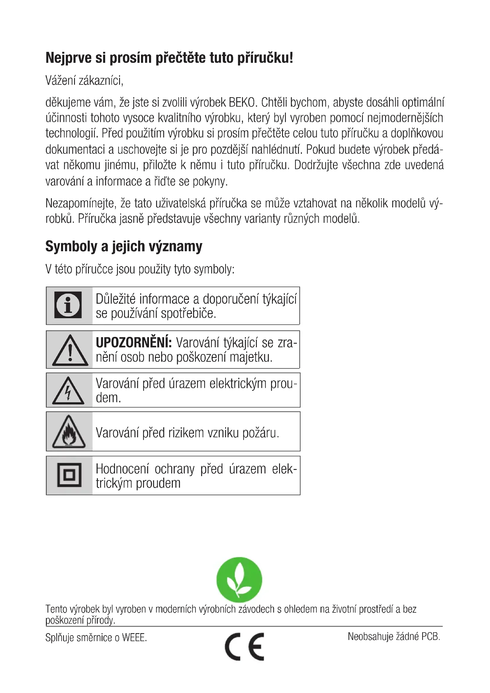 Molimo pogledajte stranicu 235 za vodič za postavljanje. Za ugradnju nape obratite se najbližem ovlaštenom servisu.Korisnik je odgovoran da pripremi lokaciju i električnu instalaciju za napu.(Slika 6)36 / BS Napa za šporet / Korisnički priručnik Rješavanje problema Izvorni razlog Pomoć Uređaj ne radi. Provjerite osigurače. Možda je osigurač pregorio, provjerite i vratite ga. Uređaj ne radi. Provjerite priključak na napajanje električnom energijom. Napon mreže mora biti između 220 i 240 V. Uređaj ne radi. Provjerite priključak na napajanje električnom energijom. Provjerite rade li drugi uređaji u vašoj kuhinji. Rasvjetna lampica ne radi. Provjerite priključak na napajanje električnom energijom. Napon mreže mora biti između 220 i 240 V. Rasvjetna lampica ne radi. Provjerite prekidač za lampicu. Prekidač za lampicu mora biti u položaju „Uključeno“. Rasvjetna lampica ne radi. Provjerite lampice. Lampice uređaja moraju svijetliti. Dovod zraka u uređaju nije dovoljan. Provjerite aluminijski filtar. U normalnim radnim uvjetima, aluminijski filtar se čisti najmanje jednom mjesečno. Dovod zraka u uređaju nije dovoljan. Provjerite odvodnik zraka (dimnjak). Prekidač za odvodnik zraka (dimnjak) trebao bi biti u položaju „Uključeno“. Dovod zraka u uređaju nije dovoljan. Provjerite karbonski filtar. Filtre uređaja s karbonskim filtrima treba zamijeniti jednom u 3 mjeseca u normalnim uvjetima. 6 Rješavanje problemaNejprve si prosím přečtěte tuto příručku! Vážení zákazníci, děkujeme vám, že jste si zvolili výrobek BEKO. Chtěli bychom, abyste dosáhli optimální účinnosti tohoto vysoce kvalitního výrobku, který byl vyroben pomocí nejmodernějších technologií. Před použitím výrobku si prosím přečtěte celou tuto příručku a doplňkovou dokumentaci a uschovejte si je pro pozdější nahlédnutí. Pokud budete výrobek předá- vat někomu jinému, přiložte k němu i tuto příručku. Dodržujte všechna zde uvedená varování a informace a řiďte se pokyny. Nezapomínejte, že tato uživatelská příručka se může vztahovat na několik modelů vý- robků. Příručka jasně představuje všechny varianty různých modelů. Symboly a jejich významy V této příručce jsou použity tyto symboly: