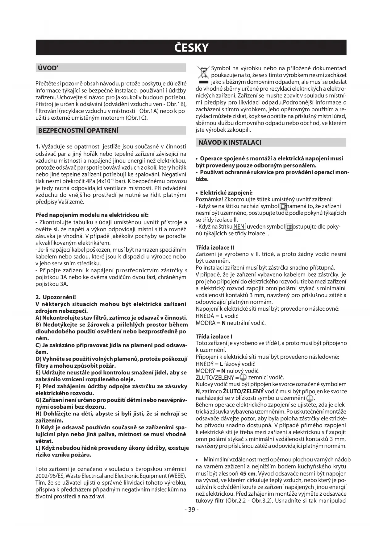 lujícími plyn nebo jiná paliva, místnost se musí vhodně větrat. L)Kdyžnebudouřádněprovedenyúkonyúdržby,existuje riziko vzniku požáru. Toto zařízení je označeno vsouladu s Evropskou směrnicí 2002/96/ES, Waste Electrical and Electronic Equipment (WEEE). Tím, že se uživatel ujistí o správné likvidaci tohoto výrobku, přispívá kpředcházení případným negativním následkům na životní prostředí a na zdraví. Symbol na výrobku nebo na přiložené dokumentaci poukazuje na to, že se stímto výrobkem nesmí zacházet jako sběžným domovním odpadem, ale musí se odeslat do vhodné sběrny určené pro recyklaci elektrických a elektro- nických zařízení. Zařízení se musíte zbavit vsouladu smístní- mi předpisy pro likvidaci odpadu.Podrobnější informace o zacházení stímto výrobkem, jeho opětovným použitím a re- cyklací můžete získat, když se obrátíte na příslušný místní úřad, sběrnou službu domovního odpadu nebo obchod, ve kterém jste výrobek zakoupili.