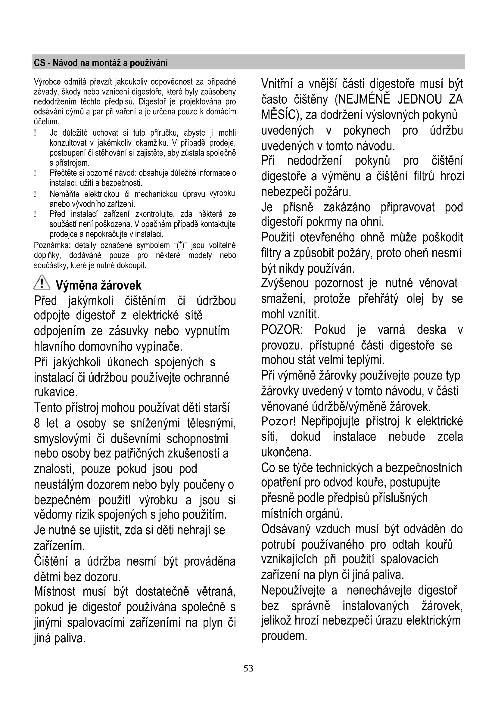 Działanie okapu Okap jest wyposażony w panel sterowania z regulacją prędkości turbiny zasysającej oraz włącznikiem oświetlenia przestrzeni roboczej pod okapem. W przypadku, gdy powietrze w pomieszczeniu kuchennym jest szczególnie zanieczyszczone, należy używać okapu ustawionego na najwyższą prędkość. Zaleca się uruchomienie okapu 5 minut przed przystąpieniem do gotowania jakichkolwiek potraw i pozostawienie go włączonym jeszcze przez ok. 15 minut po zakończeniu gotowania.52 Konserwacja Czyszczenie okapu Do czyszczenia używać WYŁĄCZNIE szmatki nawilżonej płynnymi neutralnymi środkami czyszczącymi. DO CZYSZCZENIA NIE NALEŻY UŻYWAĆ NARZĘDZI ANI PRZYRZĄDÓW! Unikać stosowania produktów zawierających środki ścierne. NIE STOSOWAĆ ALKOHOLU! Filtr przeciwtłuszczowy Zatrzymuje cząstki tłuszczu pochodzące z gotowania. Musi być czyszczony co najmniej raz w miesiącu, za pomocą środka czyszczącego nie żrącego, ręcznie lub w zmywarce w niskiej temperaturze i krótkim cyklu mycia. Mycie w zmywarce metalowego filtra tłuszczowego może spowodować jego nieznaczne odbarwienie, to jednak nie pogarsza parametrów jego pracy. Aby wyjąć filtr tłuszczowy należy pociągnąć za klamkę sprężynową. Rys. 1 Filtr na węgiel ( tylko dla wersji filtrującej) Rys. 2 Zatrzymuje przykre zapachy pochodzące z gotowania. Nasycenie filtra następuje po krótszym lub dłuższym okresie użytkowania w zależności od rodzaju kuchni i od regularności z jaką jest wykonywane czyszczenie filtra tłuszczowego. Wkład filtra powinien być w każdym razie wymieniony po upływie nie więcej niż czterech miesięcy. NIE wolno myć lub regenerować filtra. Zdjąć filtry tłuszczowe. Zamontować filtry węglowe na obudowie silnika. Sprawdzić czy kołki R znajdujące się na obudowie silnika odpowiadają otworom S, następnie obrócić filtr kierunku ruchu wskazówek zegara aż do zablokowania. W celu zdemontowania wykonać czynności w odwrotnym kierunku. Ponownie zamontować filtry tłuszczowe. Wymiana lampek Rys. 1 Przed przystąpieniem do jakichkolwiek operacji związanych z konserwacją urządzenia, należy odłączyć okap od zasilania energią elektryczną. Uwaga! Nie dotykać żarówek dopóki są gorące. Wymienić uszkodzoną żarówkę na inną tego samego typu zgodnie ze specyfikacją znajdującą się na etykiecie charakterystyki lub w pobliżu samej żarówki na okapie. Aby dostać się do gniazda żarówek należy usunąć pokrywę A. W przypadku, gdy oświetlenie nie działa należy najpierw sprawdzić, czy lampki zostały prawidło wo zamontowane. Jeżeli po przeprowadzeniu takiej kontroli oświetlenie nadal nie działa, należy zwrócić się do serwisu.53 CS - Návod na montáž a používání Výrobce odmítá převzít jakoukoliv odpovědnost za případné závady, škody nebo vznícení digestoře, které byly způsobeny nedodržením těchto předpisů. Digestoř je projektována pro odsávání dýmů a par při vaření a je určena pouze k domácím účelům. ! Je důležité uchovat si tuto příručku, abyste ji mohli konzultovat v jakémkoliv okamžiku. V případě prodeje, postoupení či stěhování si zajistěte, aby zůstala společně s přístrojem. ! Přečtěte si pozorně návod: obsahuje důležité informace o instalaci, užití a bezpečnosti. ! Neměňte elektrickou či mechanickou úpravu výrobku anebo vývodního zařízení. ! Před instalací zařízení zkontrolujte, zda některá ze součástí není poškozena. V opačném p řípadě kontaktujte prodejce a nepokračujte v instalaci. Poznámka: detaily označené symbolem “(*)” jsou volitelné doplňky, dodáváné pouze pro některé modely nebo součástky, které je nutné dokoupit. Výměna žárovek Před jakýmkoli čištěním či údržbou odpojte digestoř z elektrické sítě odpojením ze zásuvky nebo vypnutím hlavního domovního vypínače. Při jakýchkoli úkonech spojených s instalací či údržbou používejte ochranné rukavice. Tento přístroj mohou používat děti starší 8 let a osoby se sníženými tělesnými, smyslovými či duševními schopnostmi nebo osoby bez patřičných zkušeností a znalostí, pouze pokud jsou pod neustálým dozorem nebo byly poučeny o bezpečném použití výrobku a jsou si vědomy rizik spojených s jeho použitím. Je nutné se ujistit, zda si děti nehrají se zařízením. Čištění a údržba nesmí být prováděna dětmi bez dozoru. Místnost musí být dostatečně větraná, pokud je digestoř používána společně s jinými spalovacími zařízeními na plyn či jiná paliva. Vnitřní a vnější části digestoře musí být často čištěny (NEJMÉNĚ JEDNOU ZA MĚSÍC), za dodržení výslovných pokynů uvedených v pokynech pro údržbu uvedených v tomto návodu. Při nedodržení pokynů pro čištění digestoře a výměnu a čištění filtrů hrozí nebezpečí požáru. Je přísně zakázáno připravovat pod digestoří pokrmy na ohni. Použití otevřeného ohně může poškodit filtry a způsobit požáry, proto oheň nesmí být nikdy používán. Zvýšenou pozornost je nutné věnovat smažení, protože přehřátý olej by se mohl vznítit. POZOR: Pokud je varná deska v provozu, přístupné části digestoře se mohou stát velmi teplými. Při výměně žárovky používejte pouze typ žárovky uvedený v tomto návodu, v části věnované údržbě/výměně žárovek. Pozor! Nepřipojujte přístroj k elektrické síti, dokud instalace nebude zcela ukončena. Co se týče technických a bezpečnostních opatření pro odvod kouře, postupujte přesně podle předpisů příslušných místních orgánů. Odsávaný vzduch musí být odváděn do potrubí používaného pro odtah kouřů vznikajících při použití spalovacích zařízení na plyn či jiná paliva. Nepoužívejte a nenechávejte digestoř bez správně instalovaných žárovek, jelikož hro