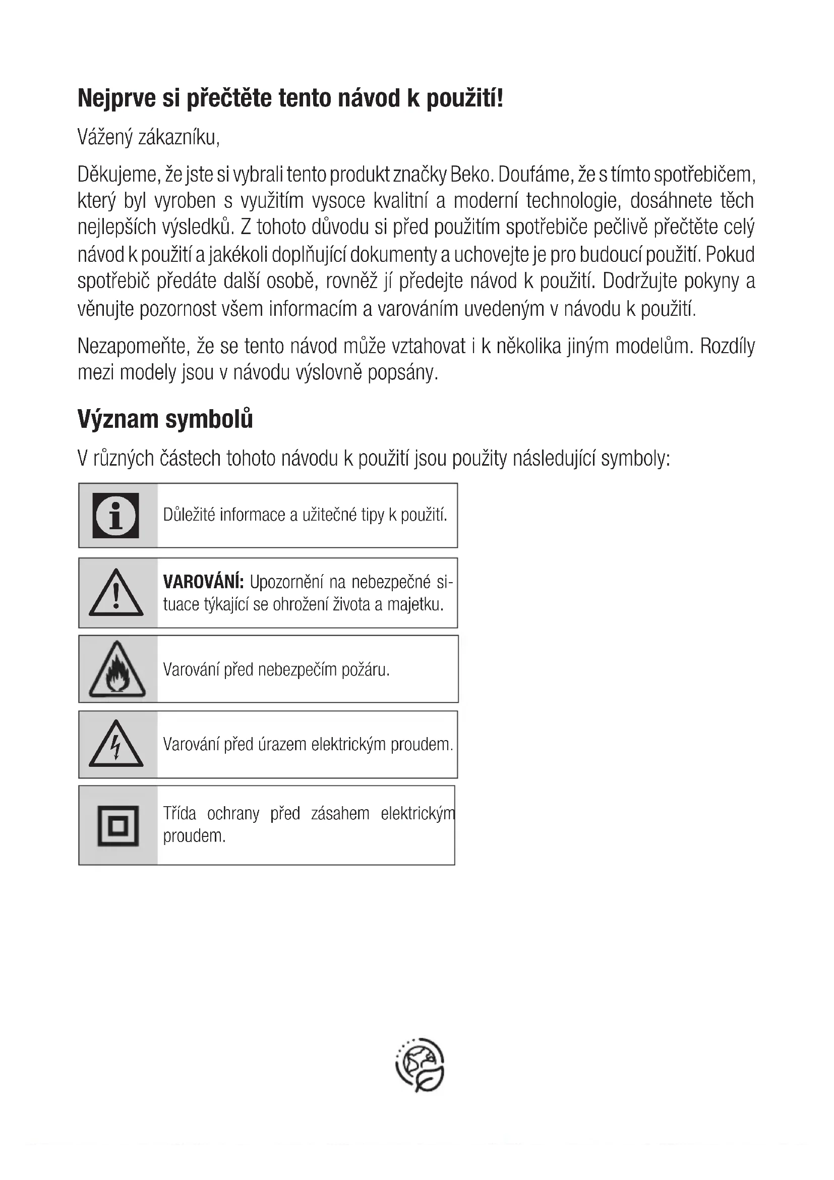 - Numetus prietaisą jis neveiks arba sugadins jį visam laikui.Nejprve si přečtěte tento návod k použití! Vážený zákazníku, Děkujeme, že jste si vybrali tento produkt značky Beko. Doufáme, že s tímto spotřebičem, který byl vyroben s využitím vysoce kvalitní a moderní technologie, dosáhnete těch nejlepších výsledků. Z tohoto důvodu si před použitím spotřebiče pečlivě přečtěte celý návod k použití a jakékoli doplňující dokumenty a uchovejte je pro budoucí použití. Pokud spotřebič předáte další osobě, rovněž jí předejte návod k použití. Dodržujte pokyny a věnujte pozornost všem informacím a varováním uvedeným v návodu k použití. Nezapomeňte, že se tento návod může vztahovat i k několika jiným modelům. Rozdíly mezi modely jsou v návodu výslovně popsány. Význam symbolů V různých částech tohoto návodu k použití jsou použity následující symboly: