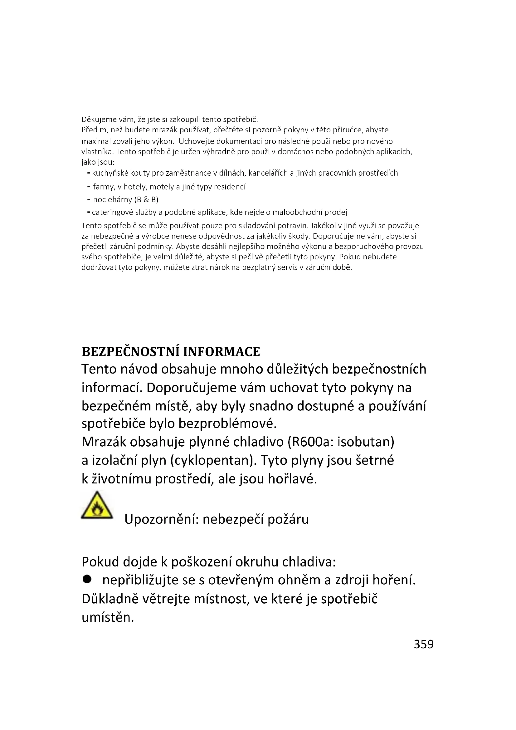 Tento návod obsahuje mnoho důležitých bezpečnostních informací. Doporučujeme vám uchovat tyto pokyny na bezpečném místě, aby byly snadno dostupné a používání spotřebiče bylo bezproblémové. Mrazák obsahuje plynné chladivo (R600a: isobutan) a izolační plyn (cyklopentan). Tyto plyny jsou šetrné k životnímu prostředí, ale jsou hořlavé. Upozornění: nebezpečí požáru Pokud dojde k poškození okruhu chladiva: nepřibližujte se s otevřeným ohněm a zdroji hoření. Důkladně větrejte místnost, ve které je spotřebič umístěn.360 Poměr času běhu: VAROVÁNÍ! Při čištění/přemísťování spotřebiče musíte dát pozor, abyste se nedotkli kovových drátů výměníku tepla na zadní straně spotřebiče. Mohli byste si poranit prsty nebo ruku, nebo poškodit spotřebič. Spotřebič není konstruován pro umístění na jiném spotřebiči. Nepokoušejte se sedat si nebo stoupat na spotřebič. Není na to konstruován. Mohli byste se zranit nebo poškodit spotřebič. Při přenášení/přesouvání spotřebiče dbejte, aby se kabel napájení nezachytil pod spotřebičem. Mohlo vy dojít k přeříznutí nebo poškození kabelu napájení. Při umísťování svého spotřebiče dejte pozor, aby se nepoškodila podlaha, potrubí, stěny atd. Nepřemisťujte spotřebič taháním za víko nebo kliku. Nenechte děti, aby si se spotřebičem hráli nebo manipulovali s ovladači. Pokud nebudou tyto pokyny dodrženy, naše společnost se zříká veškeré odpovědnosti. Neinstalujte spotřebič ve vlhkém, mastném nebo prašném prostředí, zabraňte působení přímých slunečních paprsků nebo vody. Neinstalujte spotřebič poblíž zdrojů tepla nebo hořlavých materiálů.361 Pokud dojde k výpadku proudu, neotevírejte víko. Zmrzlé potraviny by neměly být ovlivněny, pokud bude výpadek proudu kratší než 20 hodin. Pokud je výpadek proudu delší, je nutné potraviny zkontrolovat a okamžitě sníst, nebo uvařit a poté zmrazit. Pokud zjistíte, že víko truhlicového mrazáku lze obtížně otevřít, hned jak je zavřete, nemějte obavy. Je to způsobeno rozdílem tlaku, který se vyrovná, a budete moci víko otevřít za několik minut. Nepřipojujte spotřebič k napájení elektrickým proudem, dokud nejsou odstraněny všechny obaly a chrániče pro přepravu. Pokud byl spotřebič přepravován ve vodorovné poloze, před zapnutím jej nechte stát alespoň 4 hodiny, aby se usadil olej v kompresoru. Tento mrazák se smí používat pouze k zamýšleným účelům (tj. ukládání a mrazení potravin). V chladničce na víno neskladujte léky nebo materiály určené pro výzkum. Pokud budete skladovat materiál, který vyžaduje přísnou kontrolu teploty skladování, je možné, že dojde k jeho znehodnocení nebo může dojít k nekontrolované reakci a vzniku nebezpečí. Před jakoukoliv manipulací se spotřebičem, odpojte kabel napájení od zásuvky.362 Při dodání zkontrolujte, že produkt není poškozen a že všechny součásti a příslušenství jsou v dokonalém stavu. Pokud dojde k úniku chladiva, nedotýkejte se zásuvky a nepoužívejte otevřený oheň. Otevřete okno a vyvětrejte. Poté zavolejte servisní středisko a požádejte o opravu. Nepoužívejte prodlužovací kabely nebo adaptéry. Netahejte a neohýbejte kabel napájení, nedotýkejte se zásuvky mokrýma rukama. Vyhněte se poškození zástrčky nebo kabelu napájení; mohlo by dojít k úrazu elektrickým proudem nebo požáru. Neumisťujte ani neukládejte hořlavé nebo vysoce prchavé látky, jako jsou éter, benzín, LPG, propan, aerosolové nádoby, lepidla, čistý alkohol atd. Tyto materiály mohou způsobit výbuch. Je-li napájecí kabel poškozen, musí jej vyměnit výrobce, jeho servisní technik nebo podobně kvalifikovaný technik, aby nedošlo ke vzniku nebezpečných situací. Poblíž chladničky na víno nepoužívejte ani neukládejte hořlavé spreje, jako jsou barvy ve spreji. Mohlo by dojít k výbuchu nebo požáru. Na horní stranu spotřebiče nepokládejte předměty nebo nádoby s vodou. Nedoporučujeme používat prodlužovací kabely ani síťové adaptéry.363 Nelikvidujte spotřebič spálením. Při přepravě a používání spotřebiče dbejte, aby nedošlo k poškození okruhu/potrubí chladiva. V případě poškození nevystavujte spotřebič ohni, zdrojům vznícení a okamžitě vyvětrejte místnost, ve které je spotřebič umístěn. Systém chlazení umístěný za a uvnitř chladničky na víno obsahuje chladivo. Zabraňte poškození potrubí. Uvnitř prostoru pro skladování potravin ve spotřebiči nepoužívejte elektrické spotřebiče, pokud se nejedná o spotřebiče doporučené výrobcem. Nepoškoďte okruh chladiva. Nepoužívejte mechanické nástroje ani jinak neurychlujte proces rozmrazování. Používejte pouze prostředky doporučené výrobcem. Uvnitř prostoru pro skladování potravin nepoužívejte elektrické spotřebiče, pokud se nejedná o spotřebiče doporučené výrobcem. Otvory pro ventilaci spotřebiče nebo skříně, ve které je spotřebič vestavěn, udržujte volné bez překážek. Pro odstraňování námrazy nepoužívejte špičaté nebo ostré předměty. Nedotýkejte se vnitřních chladicích prvků, a to obzvláště pokud máte mokré ruce, protože byste se mohli popálit nebo zranit.364 Na pomoc odmrazování nikdy nepoužívejte vysoušeče vlasů, elektrické ohřívače a jiné podobné elektrické spotřebiče. Námrazu neškrábejte nožem nebo ostrými předměty. Mohlo by dojít k poškození okruhu chladiva a vyteklé chladivo může způsobit požár nebo poškození zraku. Nepoužívejte žádná mechanická zařízení pro urychlení procesu rozmrazování. Je absolutně nezbytné zabránit používání otevřeného ohně nebo elektrických přístrojů, jako jsou ohřívače, parní čističe, svíčky, olejové lampy a p