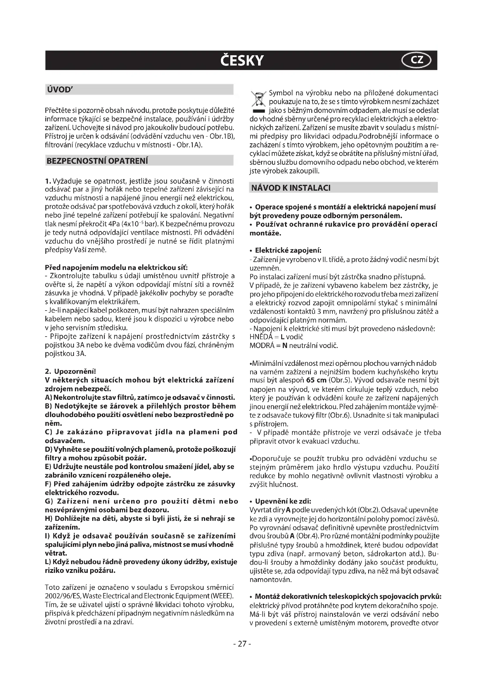 FOR EVENTUAL DAMAGES CAUSED BY BREACHING THE ABOVE WARNINGS. - 26 -ÚVOD’ Přečtěte si pozorně obsah návodu, protože poskytuje důležité informace týkající se bezpečné instalace, používání i údržby zařízení. Uchovejte si návod pro jakoukoliv budoucí potřebu. Přístroj je určen kodsávání (odvádění vzduchu ven-Obr.1B), ltrování (recyklace vzduchu vmístnosti-Obr.1A). BEZPECNOSTNÍ OPATRENÍ