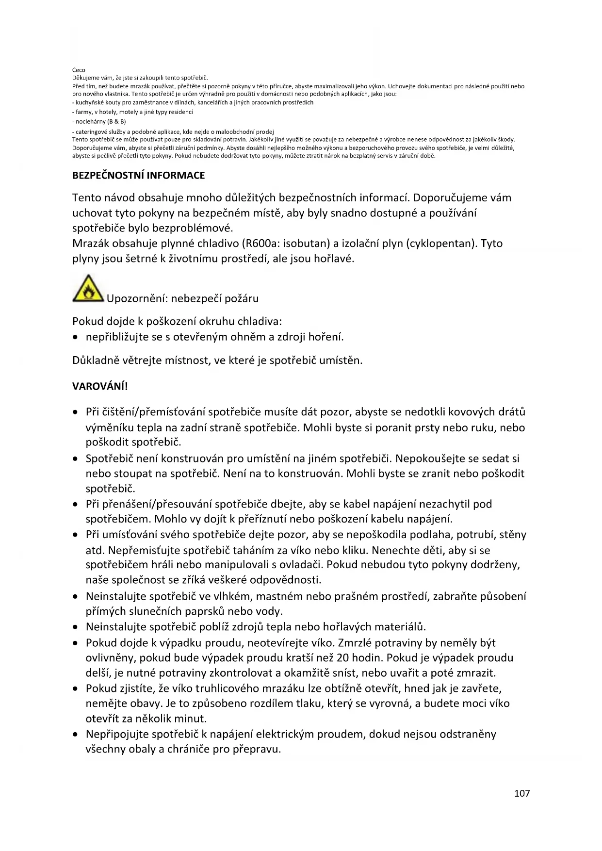 Tento návod obsahuje mnoho důležitých bezpečnostních informací. Doporučujeme vám uchovat tyto pokyny na bezpečném místě, aby byly snadno dostupné a používání spotřebiče bylo bezproblémové. Mrazák obsahuje plynné chladivo (R600a: isobutan) a izolační plyn (cyklopentan). Tyto plyny jsou šetrné k životnímu prostředí, ale jsou hořlavé. Upozornění: nebezpečí požáru Pokud dojde k poškození okruhu chladiva: