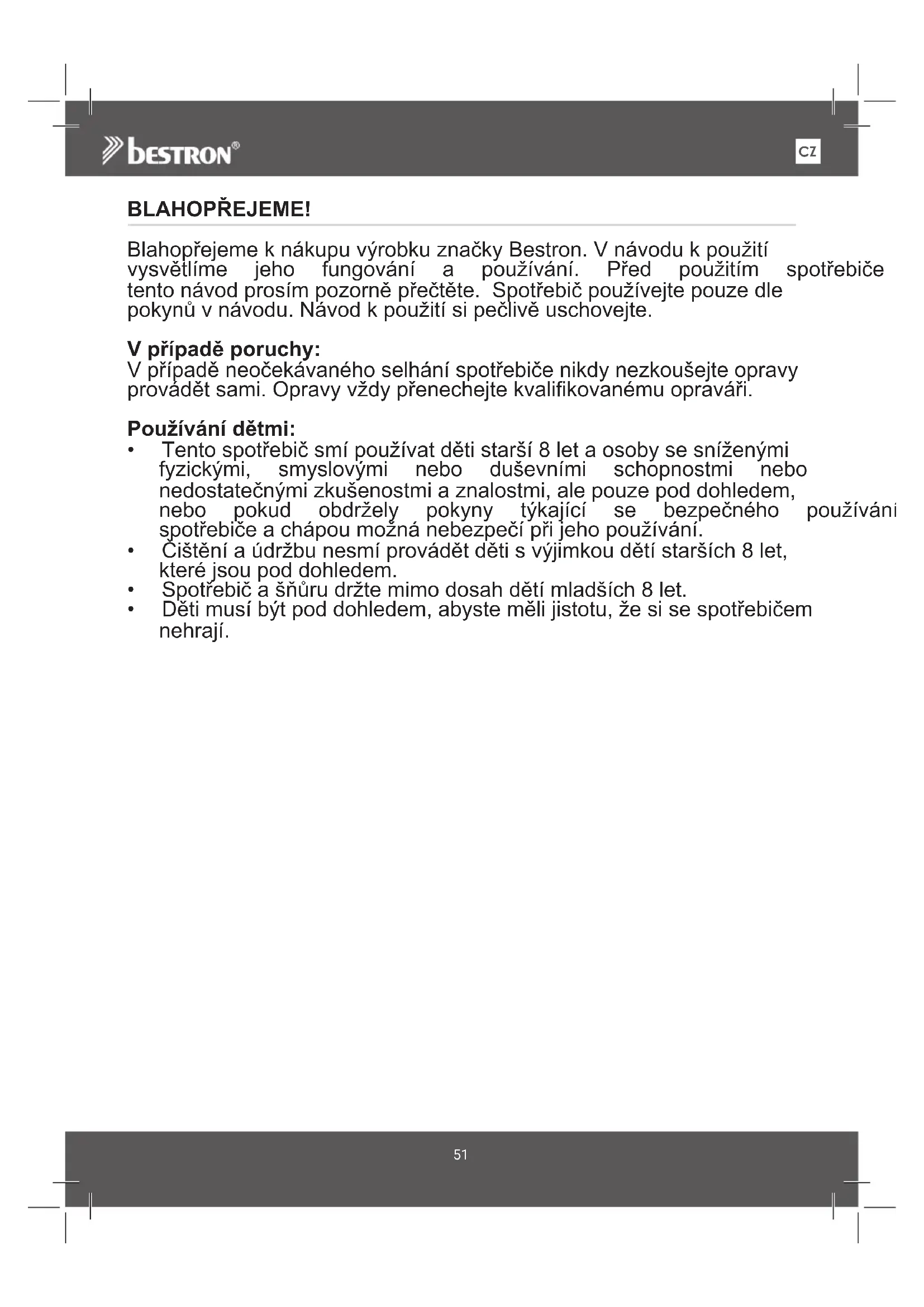 BlahopřejemeknákupuvýrobkuznačkyBestron.Vnávodukpoužití vysvětlíme jeho fungování a používání. Před použitím spotřebiče si tentonávodprosímpozorněpřečtěte.Spotřebičpoužívejtepouzedle pokynůvnávodu.Návodkpoužitísipečlivěuschovejte.