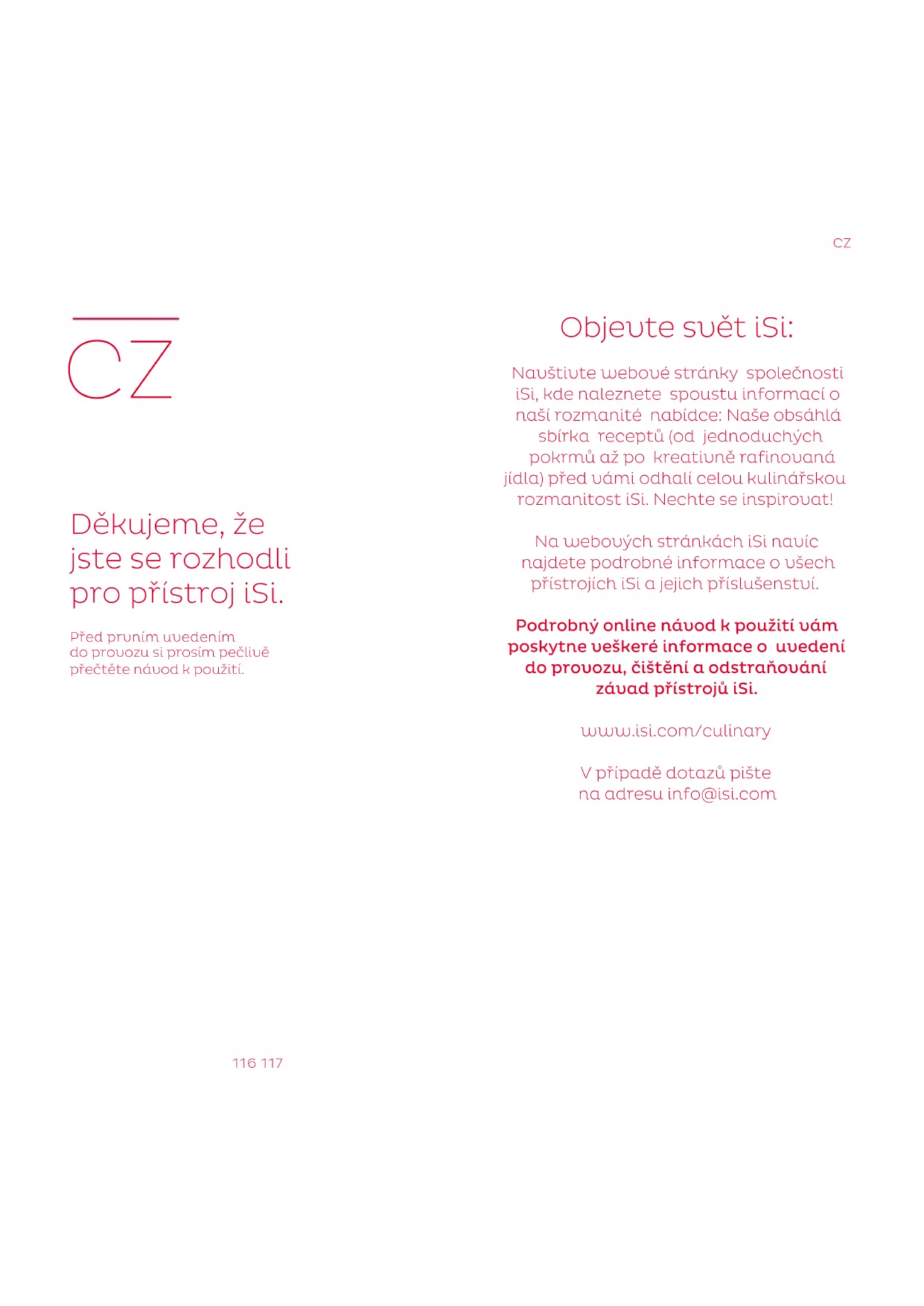 Objevte svět iSi: Navštivte webové stránky společnosti iSi, kde naleznete spoustu informací o naší rozmanité nabídce: Naše obsáhlá sbírka receptů (od jednoduchých pokrmů až po kreativně rafinovaná jídla) před vámi odhalí celou kulinářskou rozmanitost iSi. Nechte se inspirovat! Na webových stránkách iSi navíc najdete podrobné informace o všech přístrojích iSi a jejich příslušenství. Podrobný online návod k použití vám poskytne veškeré informace o uvedení do provozu, čištění a odstraňování závad přístrojů iSi. www.isi.com/culinary V případě dotazů pište na adresu info@isi.com118 119