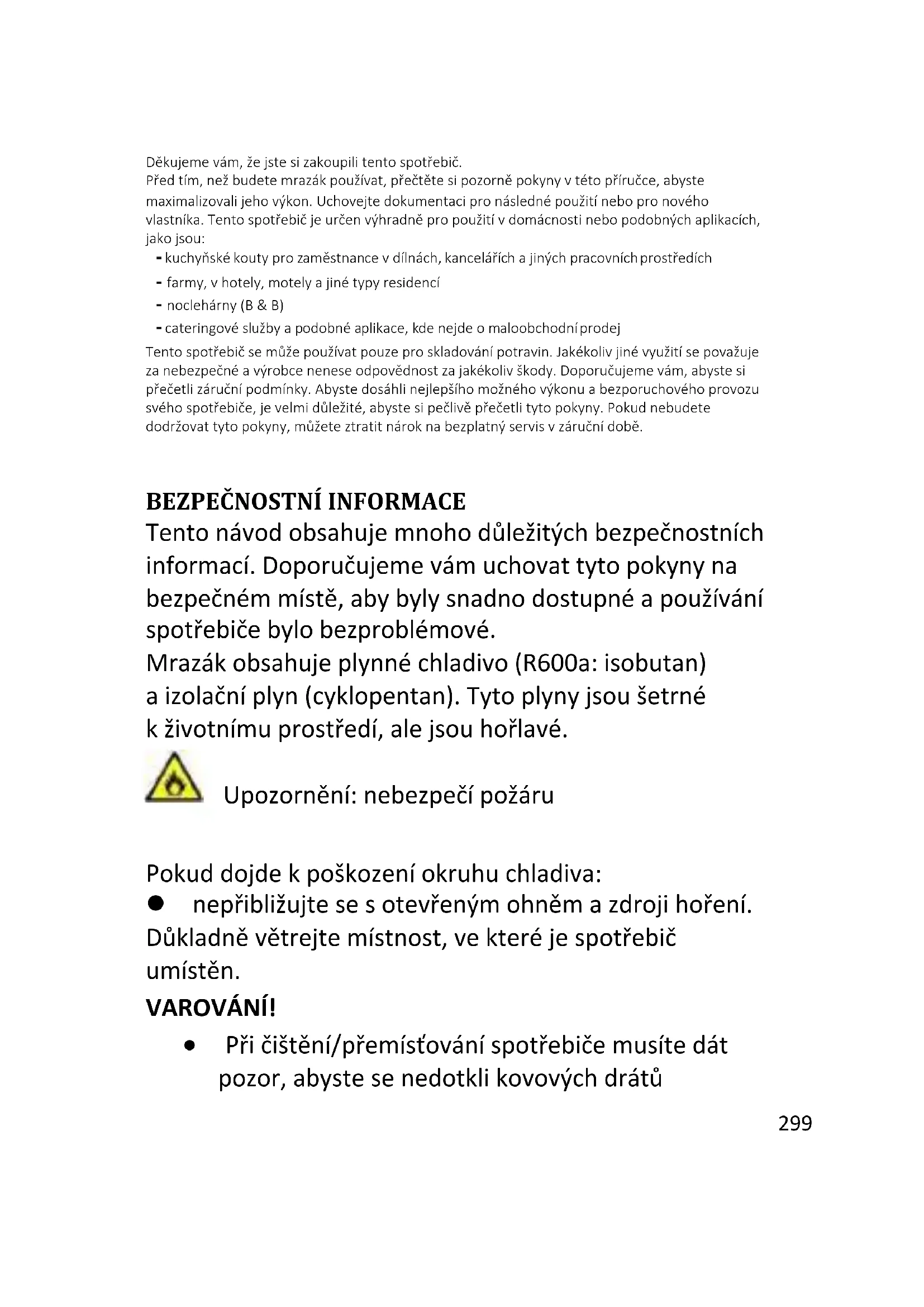 Tento návod obsahuje mnoho důležitých bezpečnostních informací. Doporučujeme vám uchovat tyto pokyny na bezpečném místě, aby byly snadno dostupné a používání spotřebiče bylo bezproblémové. Mrazák obsahuje plynné chladivo (R600a: isobutan) a izolační plyn (cyklopentan). Tyto plyny jsou šetrné k životnímu prostředí, ale jsou hořlavé. Upozornění: nebezpečí požáru Pokud dojde k poškození okruhu chladiva: nepřibližujte se s otevřeným ohněm a zdroji hoření. Důkladně větrejte místnost, ve které je spotřebič umístěn. VAROVÁNÍ! Při čištění/přemísťování spotřebiče musíte dát pozor, abyste se nedotkli kovových drátů300 výměníku tepla na zadní straně spotřebiče. Mohli byste si poranit prsty nebo ruku, nebo poškodit spotřebič. Spotřebič není konstruován pro umístění na jiném spotřebiči. Nepokoušejte se sedat si nebo stoupat na spotřebič. Není na to konstruován. Mohli byste se zranit nebo poškodit spotřebič. Při přenášení/přesouvání spotřebiče dbejte, aby se kabel napájení nezachytil pod spotřebičem. Mohlo vy dojít k přeříznutí nebo poškození kabelu napájení. Při umísťování svého spotřebiče dejte pozor, aby se nepoškodila podlaha, potrubí, stěny atd. Nepřemisťujte spotřebič taháním za víko nebo kliku. Nenechte děti, aby si se spotřebičem hráli nebo manipulovali s ovladači. Pokud nebudou tyto pokyny dodrženy, naše společnost se zříká veškeré odpovědnosti. Neinstalujte spotřebič ve vlhkém, mastném nebo prašném prostředí, zabraňte působení přímých slunečních paprsků nebo vody. Neinstalujte spotřebič poblíž zdrojů tepla nebo hořlavých materiálů. Pokud dojde k výpadku proudu, neotevírejte víko. Zmrzlé potraviny by neměly být ovlivněny, pokud bude výpadek proudu kratší než 20 hodin. Pokud je výpadek proudu delší, je nutné potraviny zkontrolovat a okamžitě sníst, nebo uvařit a poté301 zmrazit. Pokud zjistíte, že víko truhlicového mrazáku lze obtížně otevřít, hned jak je zavřete, nemějte obavy. Je to způsobeno rozdílem tlaku, který se vyrovná, a budete moci víko otevřít za několik minut. Nepřipojujte spotřebič k napájení elektrickým proudem, dokud nejsou odstraněny všechny obaly a chrániče pro přepravu. Pokud byl spotřebič přepravován ve vodorovné poloze, před zapnutím jej nechte stát alespoň 4 hodiny, aby se usadil olej v kompresoru. Tento mrazák se smí používat pouze k zamýšleným účelům (tj. ukládání a mrazení potravin). V chladničce na víno neskladujte léky nebo materiály určené pro výzkum. Pokud budete skladovat materiál, který vyžaduje přísnou kontrolu teploty skladování, je možné, že dojde k jeho znehodnocení nebo může dojít k nekontrolované reakci a vzniku nebezpečí. Před jakoukoliv manipulací se spotřebičem, odpojte kabel napájení od zásuvky. Při dodání zkontrolujte, že produkt není poškozen a že všechny součásti a příslušenství jsou v dokonalém stavu. Pokud dojde k úniku chladiva, nedotýkejte se zásuvky a nepoužívejte otevřený oheň. Otevřete okno a vyvětrejte. Poté zavolejte servisní středisko302 a požádejte o opravu. Nepoužívejte prodlužovací kabely nebo adaptéry. Netahejte a neohýbejte kabel napájení, nedotýkejte se zásuvky mokrýma rukama. Vyhněte se poškození zástrčky nebo kabelu napájení; mohlo by dojít k úrazu elektrickým proudem nebo požáru. Neumisťujte ani neukládejte hořlavé nebo vysoce prchavé látky, jako jsou éter, benzín, LPG, propan, aerosolové nádoby, lepidla, čistý alkohol atd. Tyto materiály mohou způsobit výbuch. Je-li napájecí kabel poškozen, musí jej vyměnit výrobce, jeho servisní technik nebo podobně kvalifikovaný technik, aby nedošlo ke vzniku nebezpečných situací. Poblíž chladničky na víno nepoužívejte ani neukládejte hořlavé spreje, jako jsou barvy ve spreji. Mohlo by dojít k výbuchu nebo požáru. Na horní stranu spotřebiče nepokládejte předměty nebo nádoby s vodou. Nedoporučujeme používat prodlužovací kabely ani síťové adaptéry. Nelikvidujte spotřebič spálením. Při přepravě a používání spotřebiče dbejte, aby nedošlo k poškození okruhu/potrubí chladiva. V případě poškození nevystavujte spotřebič ohni, zdrojům vznícení a okamžitě vyvětrejte místnost, ve které je spotřebič umístěn.303 Systém chlazení umístěný za a uvnitř chladničky na víno obsahuje chladivo. Zabraňte poškození potrubí. Uvnitř prostoru pro skladování potravin ve spotřebiči nepoužívejte elektrické spotřebiče, pokud se nejedná o spotřebiče doporučené výrobcem. Nepoškoďte okruh chladiva. Nepoužívejte mechanické nástroje ani jinak neurychlujte proces rozmrazování. Používejte pouze prostředky doporučené výrobcem. Uvnitř prostoru pro skladování potravin nepoužívejte elektrické spotřebiče, pokud se nejedná o spotřebiče doporučené výrobcem. Otvory pro ventilaci spotřebiče nebo skříně, ve které je spotřebič vestavěn, udržujte volné bez překážek. Pro odstraňování námrazy nepoužívejte špičaté nebo ostré předměty. Nedotýkejte se vnitřních chladicích prvků, a to obzvláště pokud máte mokré ruce, protože byste se mohli popálit nebo zranit. Na pomoc odmrazování nikdy nepoužívejte vysoušeče vlasů, elektrické ohřívače a jiné podobné elektrické spotřebiče. Námrazu neškrábejte nožem nebo ostrými předměty. Mohlo by dojít k poškození okruhu304 chladiva a vyteklé chladivo může způsobit požár nebo poškození zraku. Nepoužívejte žádná mechanická zařízení pro urychlení procesu rozmrazování. Je absolutně nezbytné zabránit používání otevřeného ohně nebo elektrických přístrojů, jako jsou ohřívače, parní čističe, svíčky, olejové lampy a podobné, pro zrychle