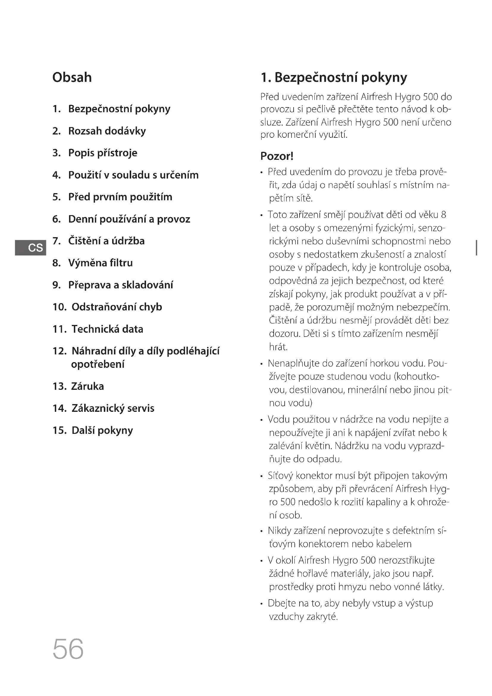 Před uvedením zařízení Airfresh Hygro 500 do provozu si pečlivě přečtěte tento návod k ob- sluze. Zařízení Airfresh Hygro 500 není určeno pro komerční využití. Pozor!
