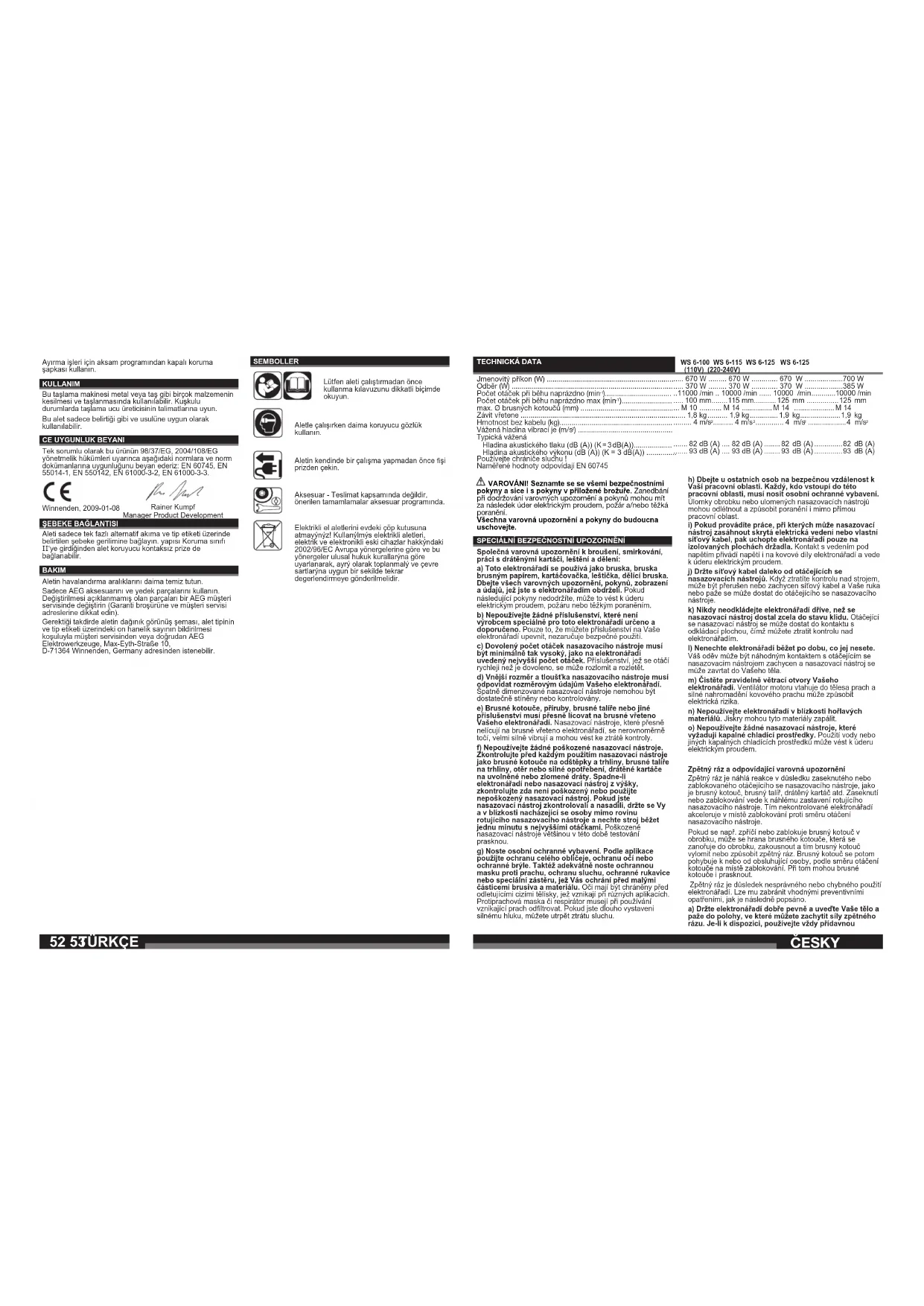 Připojit pouze do jednofázové střídavé sítě o napětí uvedeném na štítku. Lze připojit i do zásuvky bez ochranného kontaktu neboť spotřebič je třídy II. ÚDRŽBA Větrací štěrbiny nářadí udržujeme stále čisté. Používejte výhradně příslušenství a náhr.díly AEG. Díly jejichž výměna nebyla popsána nechte vyměnit v autorizovaném servisu AEG ( Dbejte pokynů uvedených v záručním listě.) Při potřebě podrobného rozkresu konstrukce, oslovte informací o typu a desetimístném objednacím čísle přímo servis a nebo výrobce, AEG Elektrowerkzeuge, Max-Eyth-Straße 10, D-71364 Winnenden, Germany SYMBOLY Před spuštěnám stroje si pečlivě pročtěte návod k používání. Při práci se strojem neustále nosit ochranné brýle. Před zahájením veškerých prací na vrtacím kladivu vytáhnout síťovou zástrčku ze zásuvky. Příslušenství není součástí dodávky, viz program příslušenství. Elektrické náradí nevyhazujte do komunálního odpadu! Podle evropské smernice 2002/96/EG o nakládání s použitými elektrickými a elektronickými zarízeními a odpovídajících ustanovení právních predpisu jednotlivých zemí se použitá elektrická náradí musí sbírat oddelene od ostatního odpadu a podrobit ekologicky šetrnému recyklování. ČESKY56 57 WS 6-100 WS 6-115 WS 6-125 WS 6-125 (110V) (220-240V) ..... 670 W ......... 670 W ............. 670 W ...................700 W ..... 370 W ......... 370 W ............. 370 W ...................385 W ..11000 /min .. 10000 /min ...... 10000 /min ............10000 /min ..... 100 mm ........115 mm ........... 125 mm ................125 mm ... M 10 ........... M 14 ............... M 14 ....................M 14 ...... 1,8 kg .......... 1,9 kg .............. 1,9 kg ....................1,9 kg ......... 4 m/s