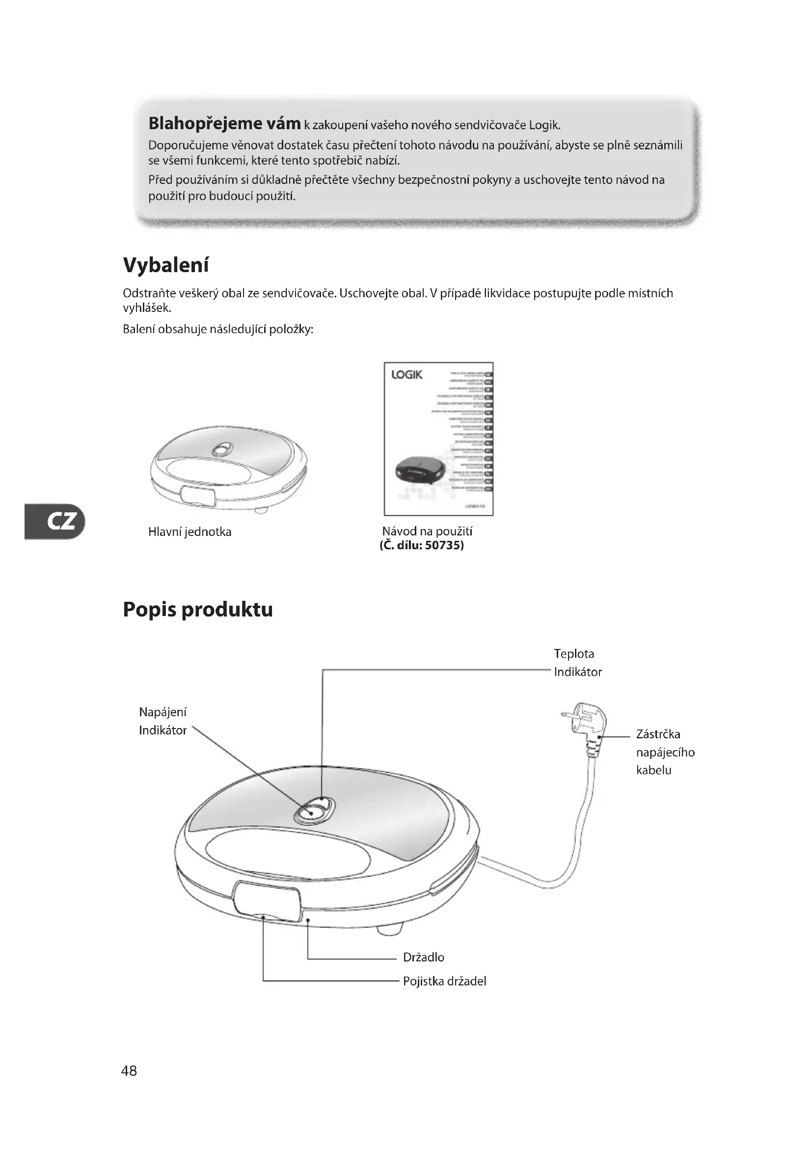 Vybalení Odstraňte veškerý obal ze sendvičovače. Uschovejte obal. V případě likvidace postupujte podle místních vyhlášek. Baleníobsahujenásledujícípoložky: Návodnapoužití (Č. dílu: 50735) Hlavní jednotka Popis produktu Zástrčka napájecího kabelu Napájení Indikátor Držadlo Pojistkadržadel Teplota Indikátor Blahopřejeme vám k zakoupení vašeho nového sendvičovače Logik. Doporučujemevěnovatdostatekčasupřečtenítohotonávodunapoužívání,abysteseplněseznámili se všemi funkcemi, které tento spotřebič nabízí. Předpoužívánímsidůkladněpřečtětevšechnybezpečnostnípokynyauschovejtetentonávodna použitíprobudoucípoužití.49