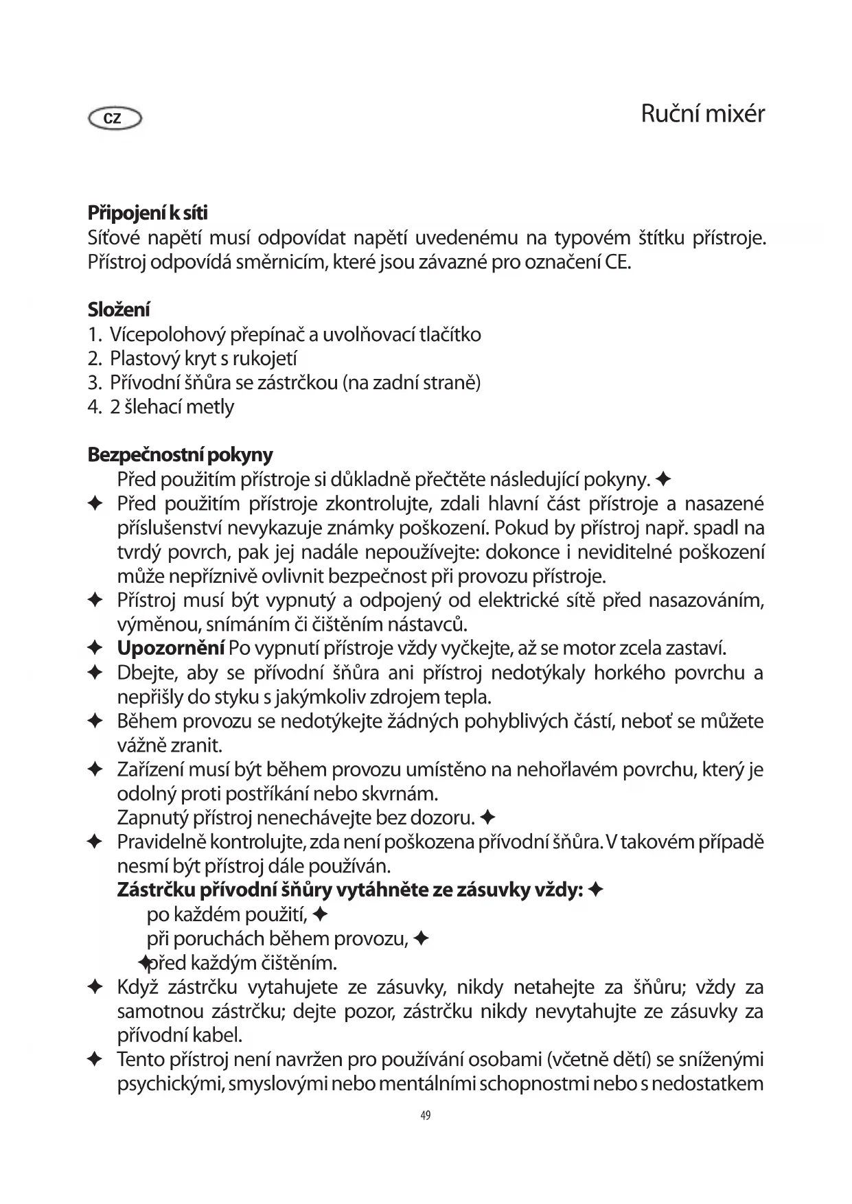 49zkušeností a znalostí, ledaže by byly pod dohledem nebo poučeni o používání přístroje osobou, zodpovídající za jejich bezpečnost. Děti by měly používat přístroj pod dohledem, aby si s ním nehrály. ✦ Upozornění: ✦ Obalový materiál udržujte z dosahu dětí, neboť je zdrojem eventuálního rizika udušení. Pokud se přístroj špatně obsluhuje anebo používá k jinému účelu, není ✦ možné převzít odpovědnost za případně vzniklé škody. Přístroj je určen pouze pro použití v domácnosti, nikoliv ke komerčním ✦ účelům. Používejte pouze originální příslušenství, neboť používání jakéhokoliv ✦ jiného příslušenství, než které bylo dodáno výrobcem, může uživatele vážně ohrozit. Z bezpečnostních důvodů musí opravy elektrických spotřebičů včetně ✦ výměny přívodní šňůry provádět kvali kovaný technik, který se řídí a dodržuje veškerá bezpečnostní ustanovení. V případě opravy proto přístroj pošlete naší službě zákazníkům. Adresu najdete v příloze návodu. Obsluha Krátkodobý provoz Jestliže používáte rychlostní stupeň 1 – 5, spotřebič nesmí být zapnutý déle než 3 minuty. Poté spotřebič vypněte a po dobu 15 minut nechte motor vychladnout. Nastavení přepínače Spotřebič je vybaven vícepolohovým přepínačem. K dispozici jsou následující nastavení: 0 Spotřebič je vypnutý 1 Velmi pomalá rychlost 2 Pomalá rychlost 3 Střední rychlost 4 Středně vysoká rychlost 5 Vysoká rychlost Při mixování lehčích a tekutých směsí nebo při míchání jakýchkoliv přísad ✦ použijte stupeň 1 a 2. Pro veškerá míchání je nejlepší použít stupeň ✦ 3 až 5. Základní informace Před prvním použitím očistěte příslušenství. ✦ Podle množství přísad použijte dostatečně hlubokou nádobu. ✦ 50Je vhodné použít jakoukoliv mísu, kulatou nádobu nebo skleněnou mísu, ✦ za předpokladu, že je odolná proti poškrábání a mohou se v ní metly volně otáčet. Po nasazení příslušenství (metly) uchopte mixér do ruky a vložte metly do ✦ nádoby naplněné přísadami. Palcem spotřebič zapněte. ✦ Jakmile práci dokončíte, nebo chcete-li ji přerušit, nejdříve spotřebič vypněte ✦ a potom jej vytáhněte metly. Šlehací metly U lehkých a tekutých směsí, jakými jsou např. krémy, bramborové kaše, šlehané bílky, zasuňte jednu nebo obě metly do otvorů v mixéru a zatlačte je lehce nahoru, až zacvaknou na svém místě. Uvolnění metel Spotřebič vypněte a vytáhněte zástrčku z elektrické zásuvky. Po lehkém stisknutí uvolňovacího tlačítka budou metly automaticky vysunuty. Čištění a údržba Před čištěním přístroje se ujistěte, že je odpojený od elektrické sítě. ✦ Abyste se vyvarovali nebezpečí úrazu elektrickým proudem, nečistěte ✦ přístroj vodou a neponořujte ho do vody. Kryt můžete otřít navlhčenou utěrkou, která nepouští vlas. ✦ Metly můžete omýt horkou vodou s jemným mycím prostředkem. ✦ Likvidace Poškozený přístroj nelikvidujte v rámci běžného domovního odpadu, ale odneste jej do sběrného střediska odpadu. Záruční podmínky Záruka na tento produkt se vztahuje na vady materiálu a výrobní závady a trvá po dobu jednoho roku od data zakoupení produktu. Touto zárukou se výrobce zavazuje k výměně nebo opravě veškerých vadných součástí prostřednictvím autorizovaného servisního místa, do kterého je reklamovaný produkt odevzdán. Záruka je platná pouze pokud je produkt užíván v souladu s instrukcemi a pokud nebyl modi kován, opravován nebo do něj nebylo jinak zasahováno neautorizovanou osobou, nebo pokud nebylo poničení způsobeno nesprávným použitím. Záruka se přirozeně nevztahuje na poškození způsobené opotřebováním, ani na křehké věci, jako skleněné a keramické předměty, žárovky apod. Tato záruka neovlivní zákonná práva, která vám, coby zákazníkovi, podle místních právních předpisů při zakoupení zboží náleží. Pokud je produkt 51poškozen a je nezbytná oprava, pečlivě jej zabalte, přiložte jméno, adresu a důvod odevzdání. Pokud se to stane v záruční době, prosím přiložte také záruční list a doklad o zaplacení.