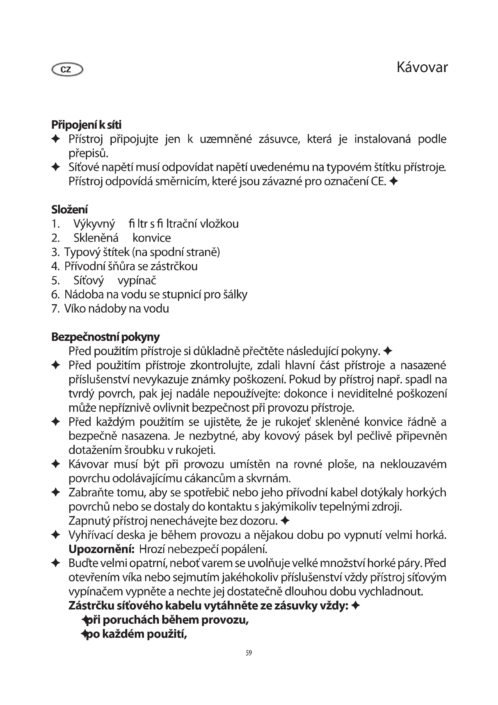 Bezpečnostní pokyny Před použitím přístroje si důkladně přečtěte následující pokyny. ✦ Před použitím přístroje zkontrolujte, zdali hlavní část přístroje a nasazené ✦ příslušenství nevykazuje známky poškození. Pokud by přístroj např. spadl na tvrdý povrch, pak jej nadále nepoužívejte: dokonce i neviditelné poškození může nepříznivě ovlivnit bezpečnost při provozu přístroje. Před každým použitím se ujistěte, že je rukojeť skleněné konvice řádně a ✦ bezpečně nasazena. Je nezbytné, aby kovový pásek byl pečlivě připevněn dotažením šroubku v rukojeti. Kávovar musí být při provozu umístěn na rovné ploše, na neklouzavém ✦ povrchu odolávajícímu cákancům a skvrnám. Zabraňte tomu, aby se spotřebič nebo jeho přívodní kabel dotýkaly horkých ✦ povrchů nebo se dostaly do kontaktu s jakýmikoliv tepelnými zdroji. Zapnutý přístroj nenechávejte bez dozoru. ✦ Vyhřívací deska je během provozu a nějakou dobu po vypnutí velmi horká. ✦ Upozornění: Hrozí nebezpečí popálení. Buďte velmi opatrní, neboť varem se uvolňuje velké množství horké páry. Před ✦ otevřením víka nebo sejmutím jakéhokoliv příslušenství vždy přístroj síťovým vypínačem vypněte a nechte jej dostatečně dlouhou dobu vychladnout. Zástrčku síťového kabelu vytáhněte ze zásuvky vždy: ✦ při poruchách během provozu, ✦ po každém použití, ✦