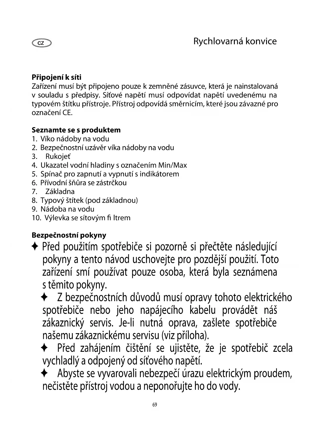 Bezpečnostní pokyny ✦ Před použitím spotřebiče si pozorně si přečtěte následující pokyny a tento návod uschovejte pro pozdější použití. Toto zařízení smí používat pouze osoba, která byla seznámena stěmito pokyny. ✦ Z bezpečnostních důvodů musí opravy tohoto elektrického spotřebiče nebo jeho napájecího kabelu provádět náš zákaznický servis. Je-li nutná oprava, zašlete spotřebiče našemu zákaznickému servisu (viz příloha). ✦ Před zahájením čištění se ujistěte, že je spotřebič zcela vychladlý a odpojený od síťového napětí. ✦ Abyste se vyvarovali nebezpečí úrazu elektrickým proudem, nečistěte přístroj vodou a neponořujte ho do vody. CZ70 ✦ Tento spotřebič mohou používat děti (staré nejméně 8 let) i osoby se sníženými fyzickými, smyslovými nebo duševními schopnostmi, nebo osoby s nedostatkem zkušeností a znalostí za předpokladu, že je jim poskytnut dohled nebo rady týkající se používání spotřebiče a plně chápou veškerá nebezpečí a příslušná bezpečnostní opatření. ✦ Dětem není dovoleno hrát si se spotřebičem. ✦ Dětem není dovoleno provádět jakékoli čištění nebo údržbu na spotřebiči, pokud nejsou pod dohledem. ✦ Spotřebič a jeho síťový kabel musí být vždy drženy mimo dosah dětí mladších 8 let. ✦ Tento spotřebič je určen pro domácí nebo podobné použití, např.: - v kuchyních pro zaměstnance, v kancelářích a v dalším komerčním prostředí, - v zemědělských oblastech, - hostyv hotelech, motelech a podobných zařízeních, - v domech pro hosty (nocleh se snídaní). ✦ Nenechávejte nikdy přístroj zapnutý bez dozoru. Nádobu naplňte požadovaným množstvím čisté vody. Dbejte na označení minimální a maximální hladiny. Přeplnění nádob y vo dou je velmi nebezpečné, neboť voda může během varu překypět ven. ✦ Buďte opatrní, protože horká pára může způsobit opaření. Je-li přístroj zapnutý, nedotýkejte se žádných jeho částí vyjma rukojeti. ✦ Upozornění: Při varu i vylévání horké vody musí být vždy konvice opatřena víkem.71 ✦ Rychlovarnou konvici je možné provozovat pouze spodstavcem, kterým je konvice vybavena. ✦ Dokud konvice automaticky nevypne, nikdy konvici zpodstavce nesnímejte, ani ji tam znovu nepokládejte. ✦ Upozornění: Obalový materiál udržujte z dosahu dětí, neboť je zdrojem eventuálního rizika udušení. ✦ Před použitím přístroje zkontrolujte, zdali hlavní část přístroje nevykazuje známky poškození a zdali jsou nástavce řádně nasazeny. Pokud by přístroj např. spadl na tvrdý povrch, pak jej nadále nepoužívejte: dokonce i neviditelné poškození může nepříznivě ovlivnit bezpečnost při provozu přístroje. ✦ Přístroj musí být umístěn pouze na nehořlavém rovném povrchu, který je odolný vůči skvrnám od vody. ✦ Spotřebič neprovozujte pod houpajícími se předměty nebo kredencem či podobnými předměty, neboť hrozí nebezpečí, že unikající pára může být pod nimi zachycována. ✦ Během provozu se vnější povrch zahřívá a zůstane horký i nějakou dobu po ukončení činnosti. ✦ Dbejte, aby se konvice ani její přívodní šňůra nedotýkaly horkého povrchu např. horkých talířů a nepřišly do styku s jakýmkoliv zdrojem tepla. ✦ Přívodní šňůru nenechávejte volně viset a vždy ji udržujte z dosahu horkého krytu. ✦ Zástrčku přívodní šňůry vytáhněte ze zásuvky vždy: - po ukončení práce s konvicí, - v případě poruchy a - během čištění. ✦ Pokud se přístroj špatně obsluhuje anebo používá k jinému účelu, není možné převzít odpovědnost za případně vzniklé škody. Tepelná bezpečnostní pojistka Tepelná bezpečnostní pojistka chrání topné těleso před přehřátím vpřípadě, že by byla konvice neopatrně zapnuta bez vody, nebo by topné těleso bylo pokryto vápenatými usazeninami. Jestliže tepelná bezpečnostní pojistka konvici vypnula, nechejte konvici dostatečně vychladnout, případně před jejím opětovným zapnutím vápenaté usazeniny odstraňte. Před prvním použitím Z hygienických důvodů při prvním použití uvařenou vodu vylijte.72 Horká voda ✦ Dokud konvice automaticky nevypne, nikdy konvici z podstavce nesnímejte, ani ji tam znovu nepokládejte. ✦ Nádobu sejměte zpodstavce. ✦ Uvolněte a otevřete víko a nádobu naplňte požadovaným množstvím čisté vody. Dbejte na označení minimální a maximální hladiny. ✦ Před zavřením víka vrácením nádoby na podstavec se ujistěte, zda není konvice zapnutá. ✦ Zapojte zástrčku do vhodné síťové zásuvky a stiskněte spínač. Rozsvítí se indikátor. ✦ Voda se začne vařit. Po dosažení bodu varu integrované vypínání tlakem páry přístroj automaticky vypne. Indikátor zhasne. ✦ Chcete-li proces ohřívání přerušit, nastavte spínač do polohy Vypnuto (O ). ✦ Nádobu sejměte zpodstavce a horkou vodu vylijte. ✦ Nemá-li unikat horká pára, zajistěte, aby víko zůstalo při vylévání vody zavřené. ✦ Po používání vytáhněte zástrčku ze síťové zásuvky. ✦ Zbývající vodu nenechávejte v nádobě. Odstranění vápenatých usazenin ✦ Vzávislosti na kvalitě používané vody se může na topném tělese usazovat vodní kámen. Doporučujeme usazeniny pravidelně odstraňovat.. Reklamace nebude uznána, dojde-li k poruše spotřebiče z důvodu nedostatečného odstraňování vodního kamene. ✦ Doporučujeme používat směs 0,5 litru vody a 40ml octa (okoncentraci 25 %). - Tento roztok nalijte do nádoby. - Konvici zapněte a roztok nechte projít varem. - Horký roztok nechte chvíli působit. - Konvici poté vyprázdněte a několikrát vypláchněte čistou vodou. ✦ Během odvápňování zajistěte dostatečné větrání a octové 