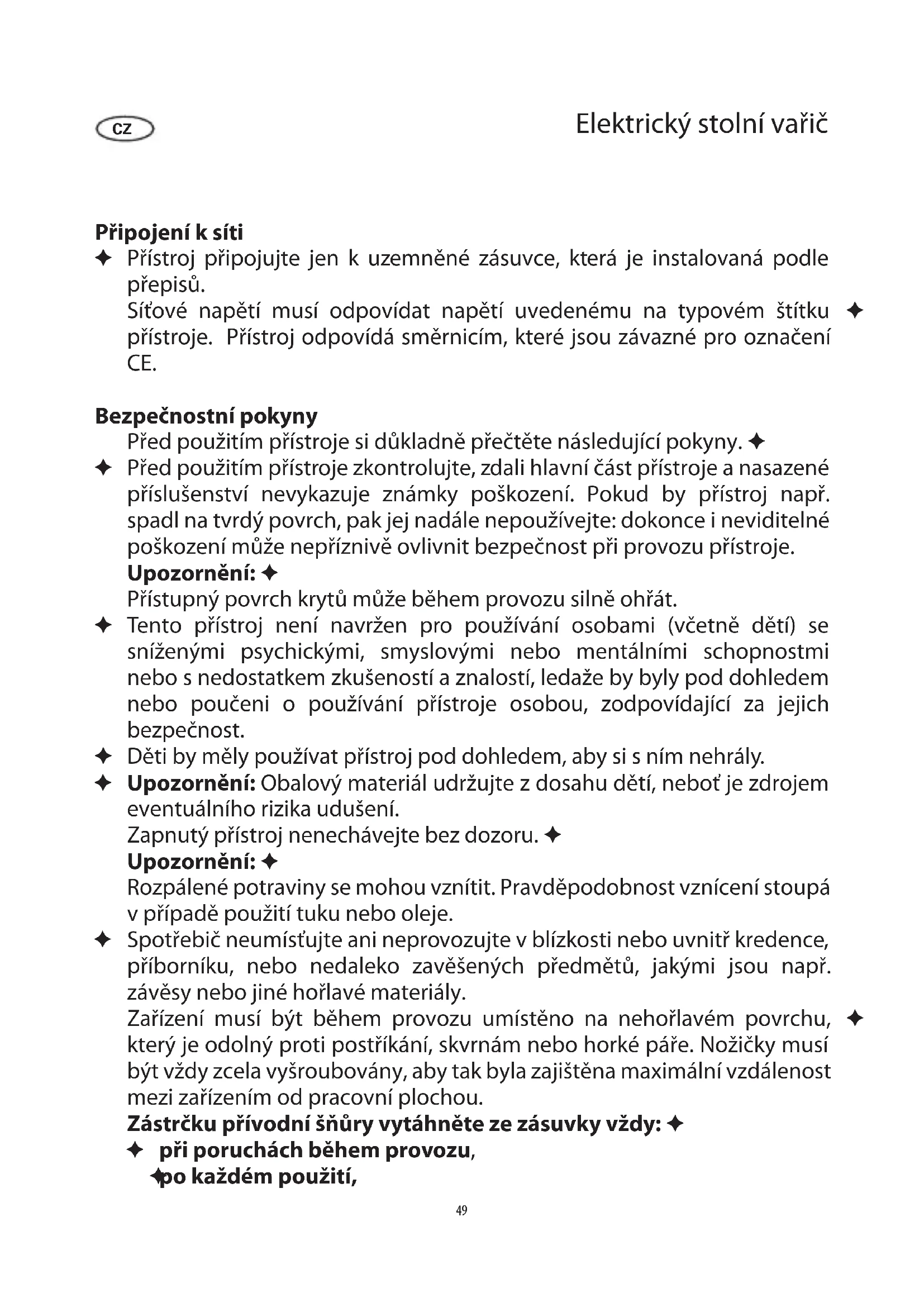 49před každým čištěním. ✦ Při odpojování přívodní šňůry ze zásuvky nikdy netahejte za vlastní ✦ kabel, vždy ji uchopte za vidlici. Přívodní šňůru nenechávejte volně viset v prostoru. ✦ Vždy dbejte na to, aby přívodní šňůra ať již tohoto, nebo jakéhokoliv ✦ jiného spotřebiče, byla vždy udržována v bezpečné vzdálenosti od jeho horkých částí. Tento spotřebič není navržen, aby byl používán spolu s externími ✦ spínacími hodinami (časovačem), nebo byl ovládán systémem dálkového ovládání Pokud se přístroj špatně obsluhuje anebo používá k jinému účelu, není ✦ možné převzít odpovědnost za případně vzniklé škody. Přístroj je určen pouze pro použití v domácnosti, nikoliv ke komerčním ✦ účelům. Používejte pouze originální příslušenství, neboť používání jakéhokoliv ✦ jiného příslušenství, než které bylo dodáno výrobcem, může uživatele vážně ohrozit. Z bezpečnostních důvodů musí opravy elektrických spotřebičů včetně ✦ výměny přívodní šňůry provádět kvali kovaný technik, který se řídí a dodržuje veškerá bezpečnostní ustanovení. V případě opravy proto přístroj pošlete naší službě zákazníkům. Adresu najdete v příloze návodu. Uvedení do chodu Před prvním používáním ponechejte spotřebič zapnutý po dobu asi ✦ 3 minut na nejvyšší výkon (nepoužívejte hrnec ani pánev) a současně dbejte na dostatečnou ventilaci prostoru. Tímto postupem provedete ‚vypálení‘ ochranné vrstvy, která chrání plotýnku před korozí. Během tohoto procesu můžete ucítit slabý zápach nebo nepatrný kouř. Tento stav je zcela normální a netrvá dlouho. Potom spotřebič očistěte podle pokynů uvedených v následující části ✦ Čištění a údržba. Obsluha Hrnec nebo pánev umístěte na plotýnku vždy před zapnutím zařízení. ✦ Ujistěte se, že je vnější povrch hrnce suchý a čistý. Znečištěné pánve ✦ nebo hrnce nepoužívejte. Používejte pouze hrnce nebo pánve s rovným dnem, zabráníte tím ✦ poškození plotýnky. Nejvhodnější jsou hrnce speciálně navržené pro elektrické plotýnky (viz. obr. I). Vždy se ujistěte, že rozměr dna používaného hrnce nebo pánve odpovídá ✦ 50rozměru plotýnky. Pokud se budete řídit tímto pravidlem, budete minimalizovat tepelné ztráty a zabráníte poškození plotýnky, které může nastat při nerovnoměrném rozvádění tepla. Nastavení regulátoru teploty 6 : Předvaření a rychlé smažení ✦ 4-5 : Běžné vaření, smažení ✦ 3-4 : Slabé vaření ✦ 1-2 : Udržování teplého jídla ✦ Po použití nastavte regulátor teploty do polohy ‘z’. Pokud chcete mít jistotu, že je spotřebič úplně vypnutý, vytáhněte přívodní šňůru ze síťové zásuvky. Indikátor Indikátor svítí po dobu vyhřívání plotýnky. Zhasne po dosažení nastavené teploty. Čištění a údržba Před zahájením čištění se ujistěte, že je přístroj zcela vychladlý a odpojený ✦ od elektrické sítě. Z důvodu nebezpečí úrazu elektrickým proudem nepoužívejte k čištění ✦ spotřebiče vodu a spotřebič ani do vody neponořujte. Nepoužívejte brusné nebo drsné čistící roztoky. ✦ Po použití odstraňte skvrny z plotýnek navlhčenou utěrkou. ✦ Času od času je nutné použít k ošetření plotýnky speciální čistící ✦ prostředek. Likvidace Poškozený přístroj nelikvidujte v rámci běžného domovního odpadu, ale odneste jej do sběrného střediska odpadu. Záruční podmínky Záruka na tento produkt se vztahuje na vady materiálu a výrobní závady a trvá po dobu jednoho roku od data zakoupení produktu. Touto zárukou se výrobce zavazuje k výměně nebo opravě veškerých vadných součástí prostřednictvím autorizovaného servisního místa, do kterého je reklamovaný produkt odevzdán. Záruka je platná pouze pokud je produkt užíván v souladu s instrukcemi a pokud nebyl modi kován, opravován nebo do něj nebylo jinak zasahováno neautorizovanou osobou, nebo pokud nebylo poničení způsobeno nesprávným použitím. Záruka se přirozeně nevztahuje na poškození způsobené opotřebováním, ani na křehké věci, jako skleněné 51a keramické předměty, žárovky apod. Tato záruka neovlivní zákonná práva, která vám, coby zákazníkovi, podle místních právních předpisů při zakoupení zboží náleží. Pokud je produkt poškozen a je nezbytná oprava, pečlivě jej zabalte, přiložte jméno, adresu a důvod odevzdání. Pokud se to stane v záruční době, prosím přiložte také záruční list a doklad o zaplacení.